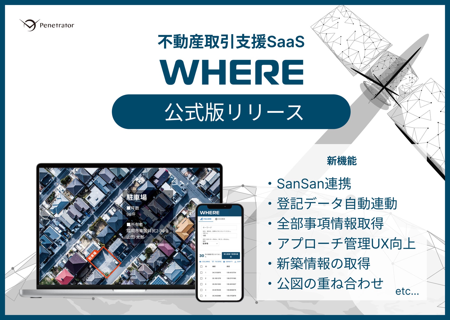株式会社Penetrator(本社:東京都文京区、代表取締役:阿久津岳生、以下当社)は、9月13日、不動産取引支援SaaS『WHERE』の公式版をリリースしたことをお知らせいたします。『WHERE』の利用についてはこちらからお申し込み可能です。→https://pntwhere.com/contact