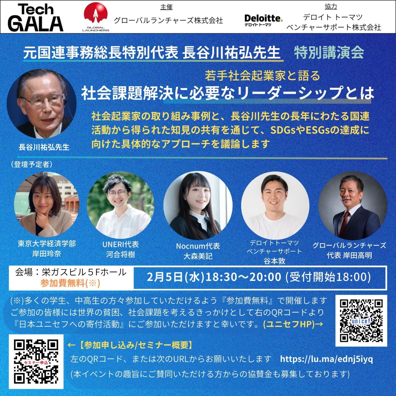 元国連事務総長特別代表 長谷川祐弘先生 特別講演会 『若手社会起業家と語る 社会課題解決に必要なリーダーシップとは』 主催:グローバルランチャーズ株式会社 協力:デロイトトーマツベンチャーサポート株式会社 |