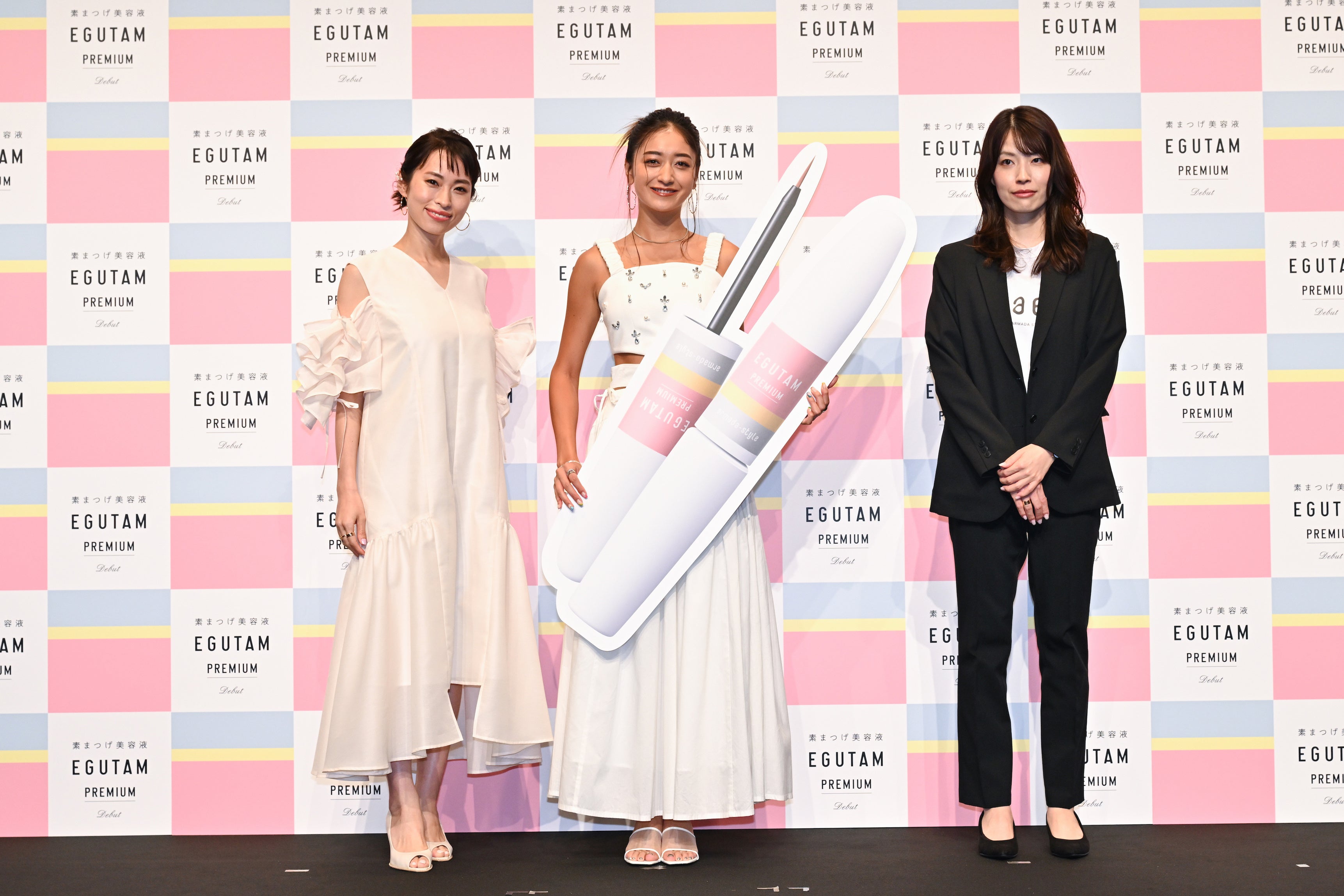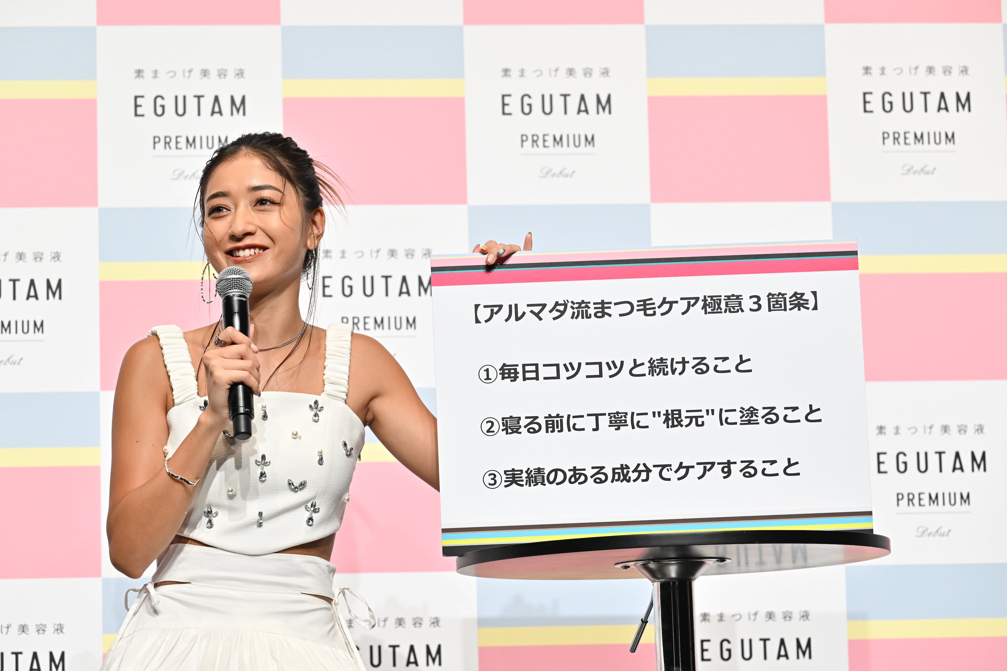エグータム シリーズの1日アンバサダーとして、みちょぱこと、池田美優さんが登場。「今日はマスカラで長さとボリュームを出して“素まつげ”を意識したメイクです!実は、25歳を機につけまつげを卒業したんです。同時にまつ育も頑張ってきましたが、エグータム プレミアムを事前に使わせていただき、約1・2週間でまつげの成長を実感しました。」と、さっそく商品の魅力をアピール。今年3月にハワイ、そして4月に京都と素敵な挙式が話題になったみちょぱさん。結婚式に向けて美容で何か特別に取り組んだことはありますか?との質問には、「週1回パーソナルジムに通い、日頃から鍛えているので焦って特別何かしたわけではないですが、背中が大きく開いたドレスだったので背中のケアをしたくらいです。美容も日々の積み重ねが大切ですね。」とコメント。ストイックなマインドに対し聞かれると「変にプライドが高いんだと思います。なめられたくないし、周りに何も言わせないくらいになりたいという思いがあって、そのために日々頑張ってかっこいい姿でいたい。」と自身のこだわりを語りました。
