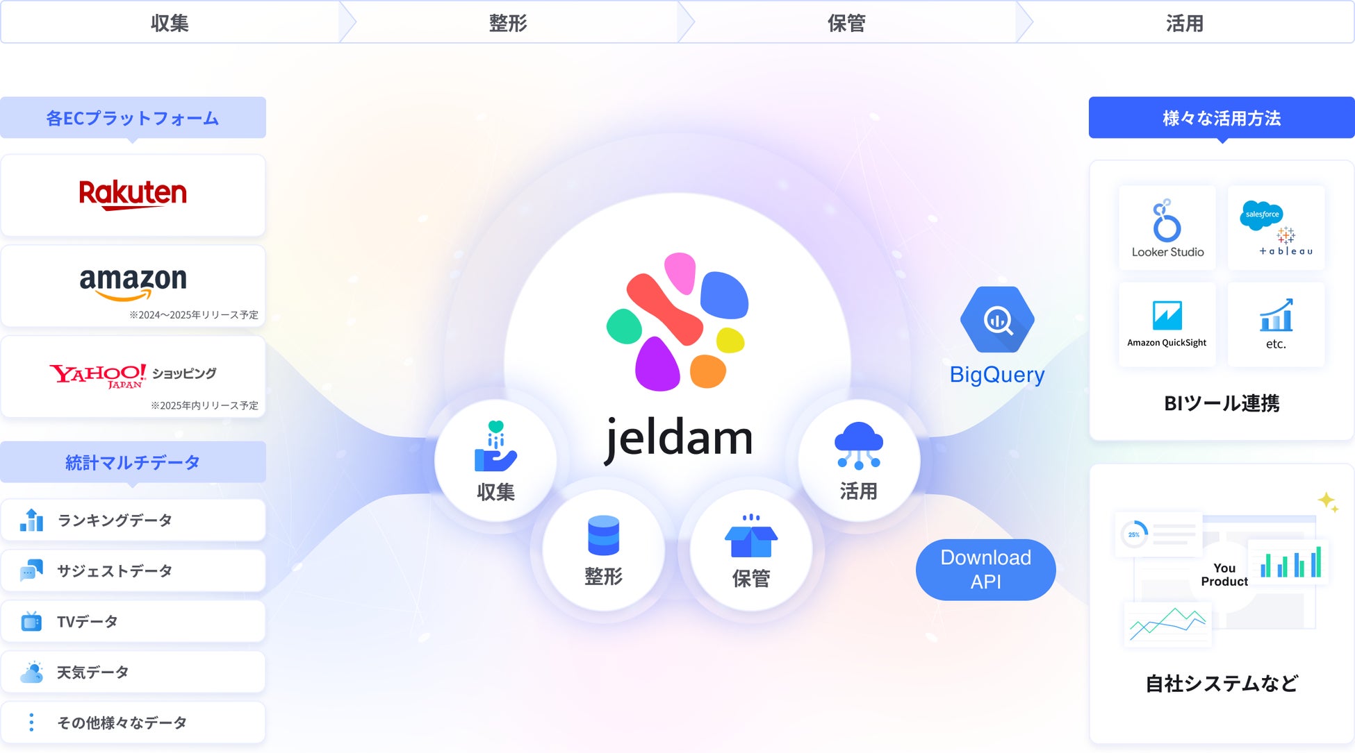 現在は楽天に関するデータのみの提供ですが、今後はAmazon(SP-API/PA-API)やYahooショッピング、その他ASPのデータも収集〜提供を行う予定です。Jeldamを活用することで、ECモールやプラットフォームを横断したクロスチャネルでの分析も可能となります。