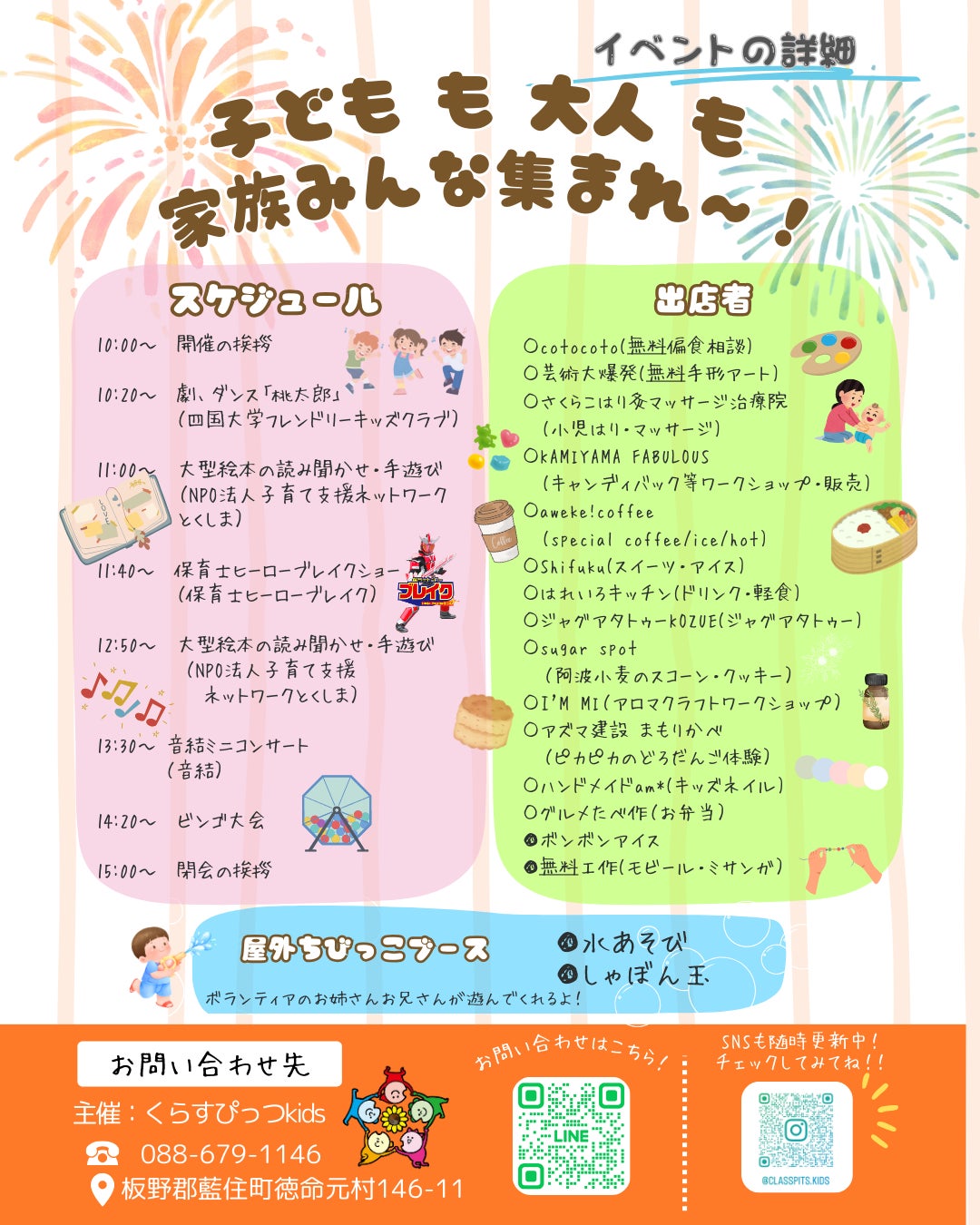 くらすぴっつ株式会社(代表取締役:十川夏来)の運営している児童発達支援事業所くらすぴっつkids(徳島県板野郡藍住町徳命元村146−11)は8月で1周年を迎えます。今回、周年イベントとして地域の子どもたちに何かできることを…と考え夏祭りを企画しました。地域で子育てを応援したい事業者やボランティアに協力してもらって、相談ブース、ワークショップ、飲食販売、ステージショー、水遊びブースなど親子で一日楽しめるイベントとなっています。