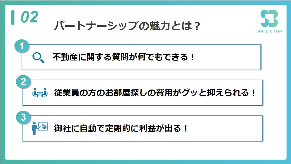 企業様の不動産に関する悩みを解決しながら、従業員の方々のお部屋探しをサポートし、さらに企業様の利益を確保する仕組みを提供いたします。