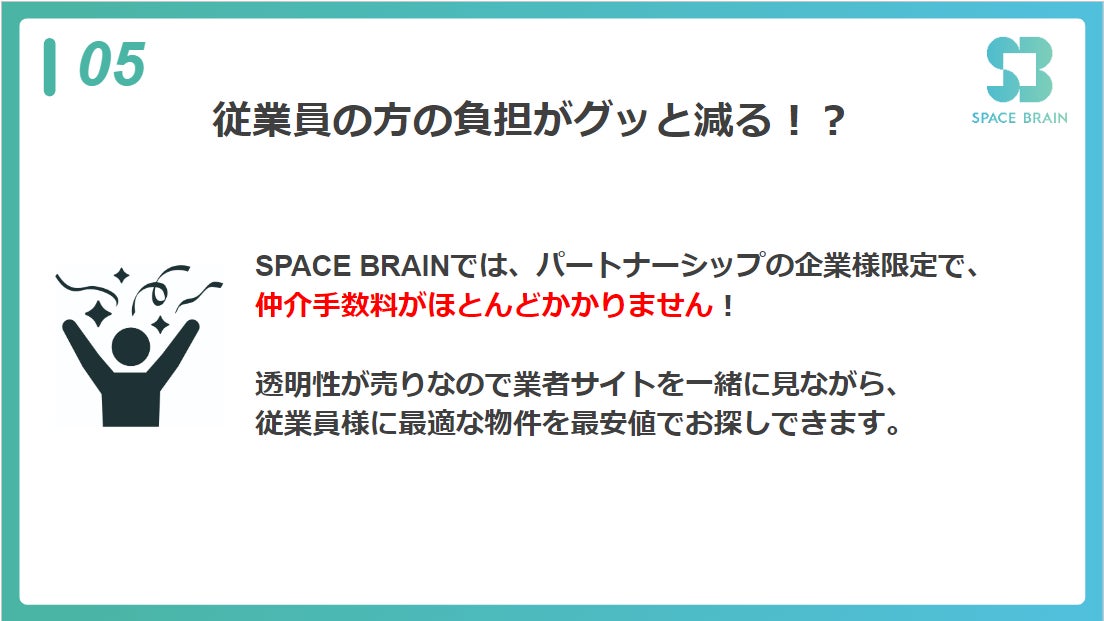 御社の従業員様が新しい住まいを探す際、その費用をしっかりと抑えることができるのが当社の強みです。