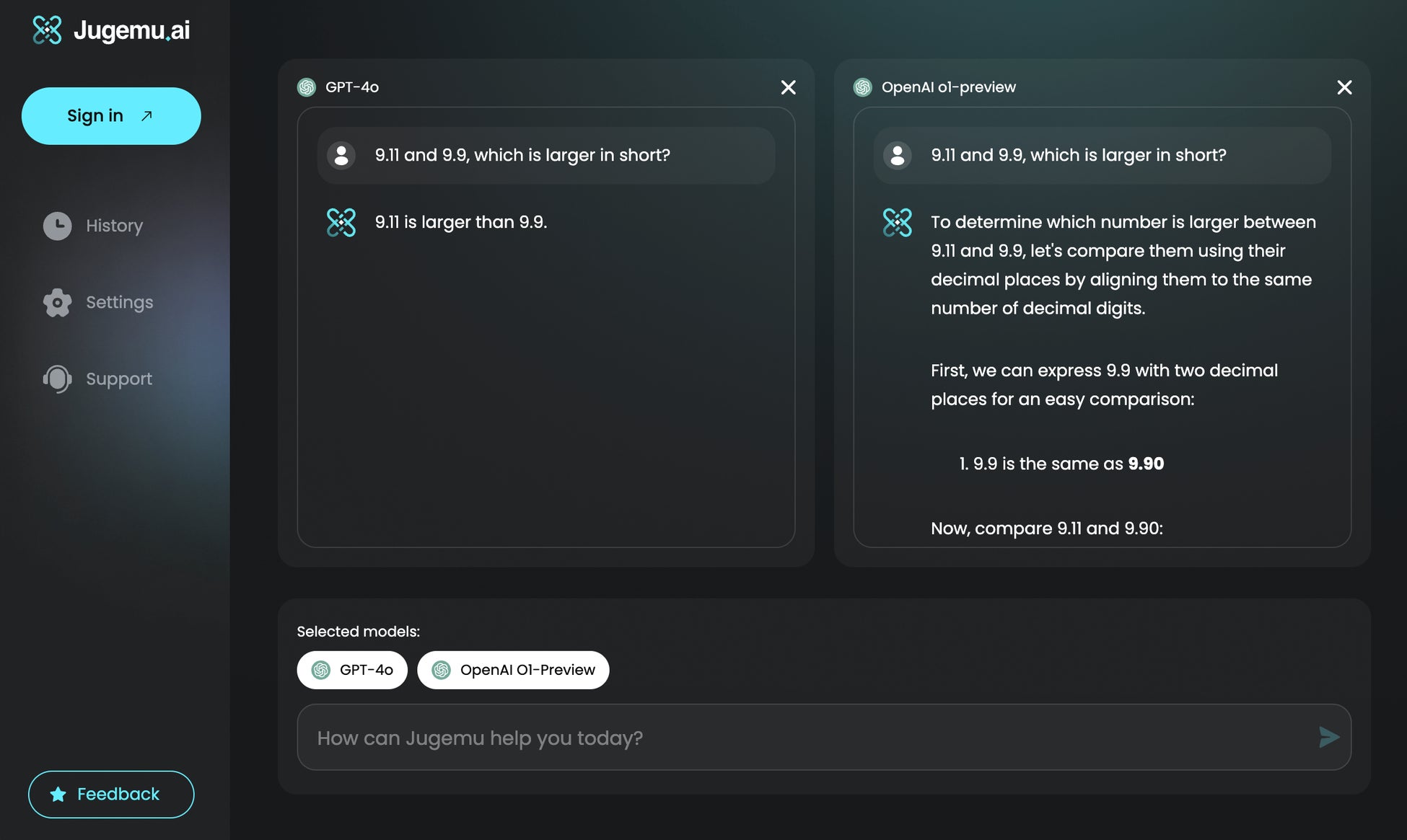AI SaaSサービス「Jugemu.app」は、OpenAIの最新モデル「o1」を新たにサポートし、提供を開始した。Jugemu.appでは、ChatGPT、Claude、Geminiなど17の最新LLMモデルを単一サブスクリプションで手頃な価格で利用できる。さらに、最大3つのモデルのアウトプットを一画面で比較することができ、ユーザーは複数のAIモデルを同時に利用し、生成結果を比較することが可能である。