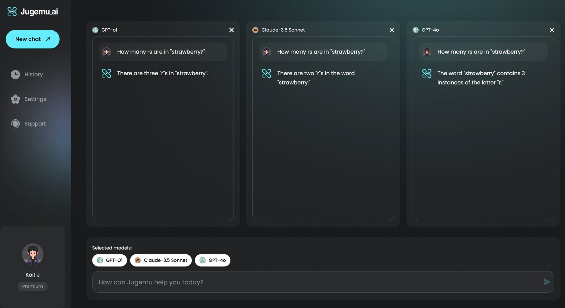 Jugemu.appは、生成AIを民主化するために設計されたAI SaaSサービスである。本サービスでは、ChatGPT、Claude、Geminiなど、17種類の最新LLMモデルを単一サブスクリプションで手頃な価格で提供している。さらに、最大3つのモデルのアウトプットを一画面で比較できる機能を備え、生成結果の違いを直感的に確認することが可能である。以下は、Jugemu.appの主な特徴である。