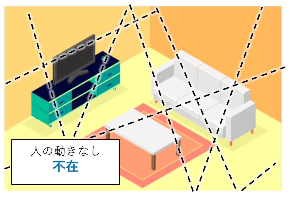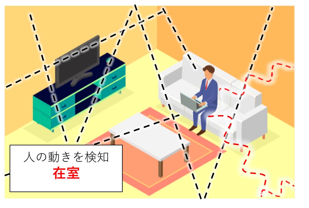 主に無線通信用電波として知られるWi-Fi電波を用いて人の動きを検知する技術のことです。人の動きがWi-Fi電波の波形に影響を与えることから、波形状況をAIが自動分析することで在室状況を確認することが可能です。カメラやウェアラブルデバイス無しで宅内の人の動きを検知することが可能なため、プライバシーやコスト、煩わしさの観点からメリットが大きいソリューションとして期待されております。