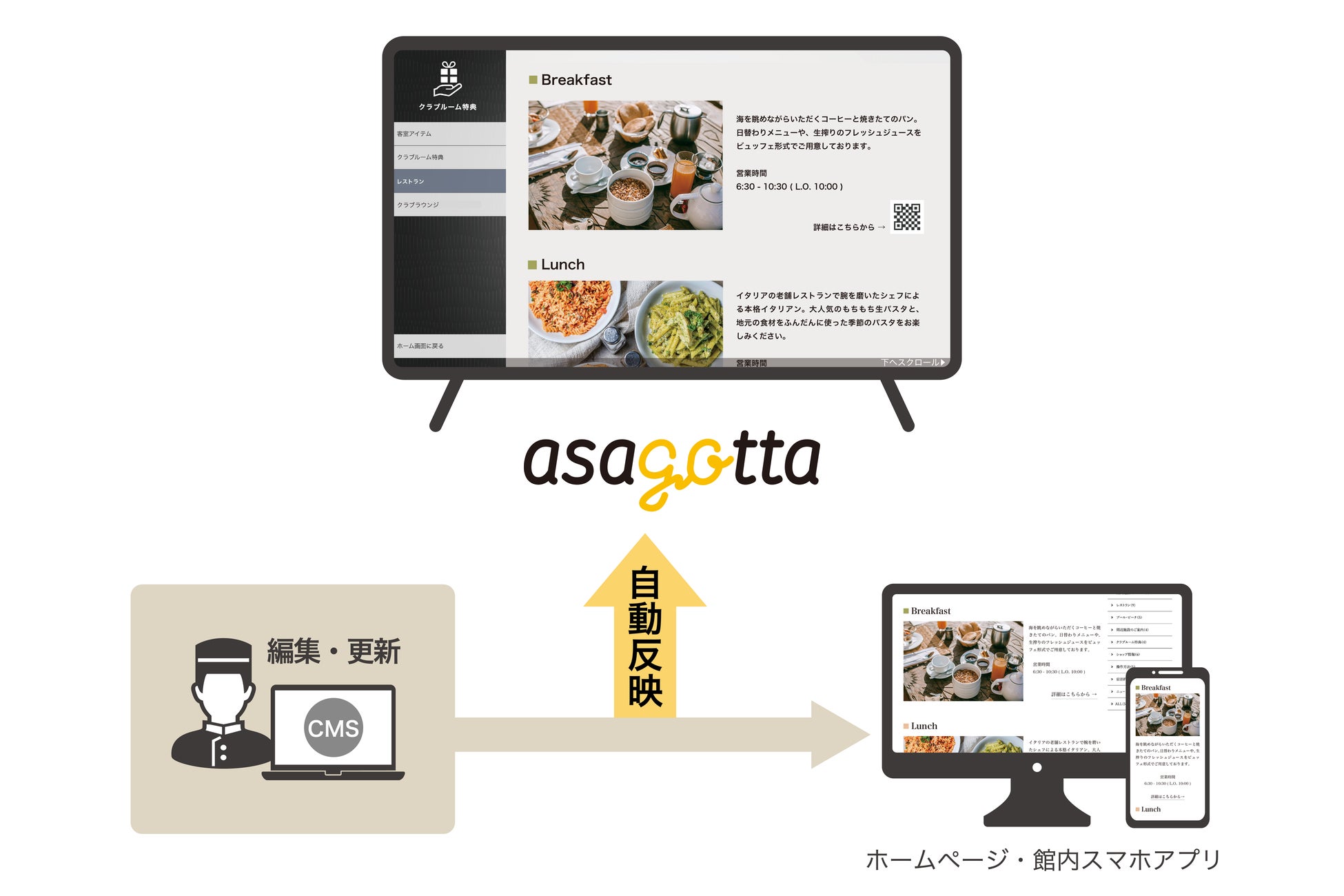 ホームページや館内用スマホアプリ等でご利用中のCMSと、asagottaとの連携ができるようになります。CMSでのコンテンツ更新はホームページ・館内スマホアプリの更新と連動して、客室テレビにも自動反映されます。