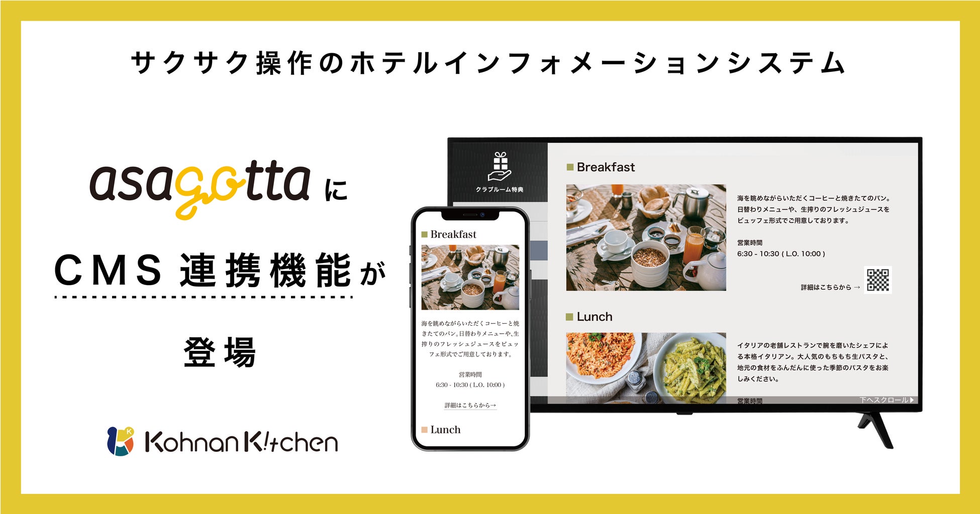 合同会社甲南キッチン(兵庫県神戸市、代表社員:砂田祥平)は、ホテルインフォメーションシステム「asagotta」のオプション機能として、新たにCMS連携機能を追加しました。