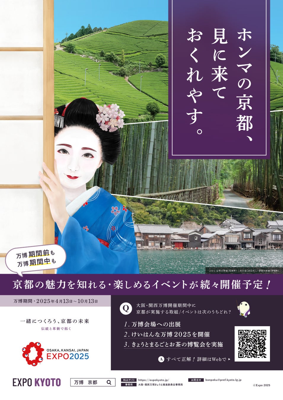 完成したキービジュアルを博物館やスポーツ施設など府内の主要施設・駅に掲示しています。舞妓さんが万博と京都にまつわるクイズを出題しているので、ぜひ公式HPを見ながら正解を当ててみてください。