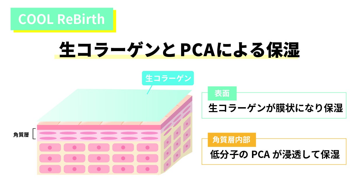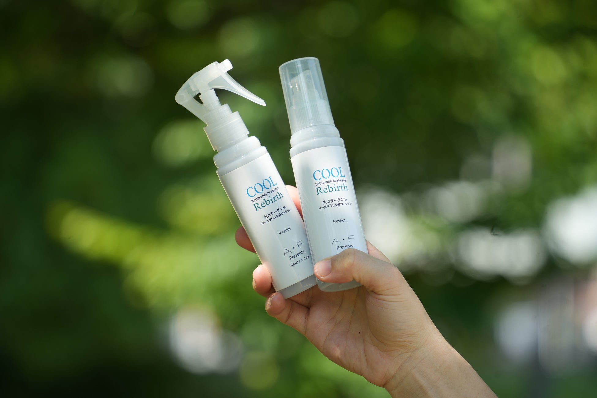 「Cool Rebirth」は、独自配合により熱帯魚のうろこ由来の生コラーゲンが皮膚の上で膜状となって水分保持し、一緒にひんやり成分も肌の上に保持されるので、長時間にわたって冷感と潤いがしっかりと感じられ、快適に過ごせます。さらに、保湿成分である低分子のPCAが角質層内部に浸透し、内部からも保湿します。加えて、グリチルリチン酸2K配合により、熱を持った肌をいたわり、日焼け後のケアにも適しています。