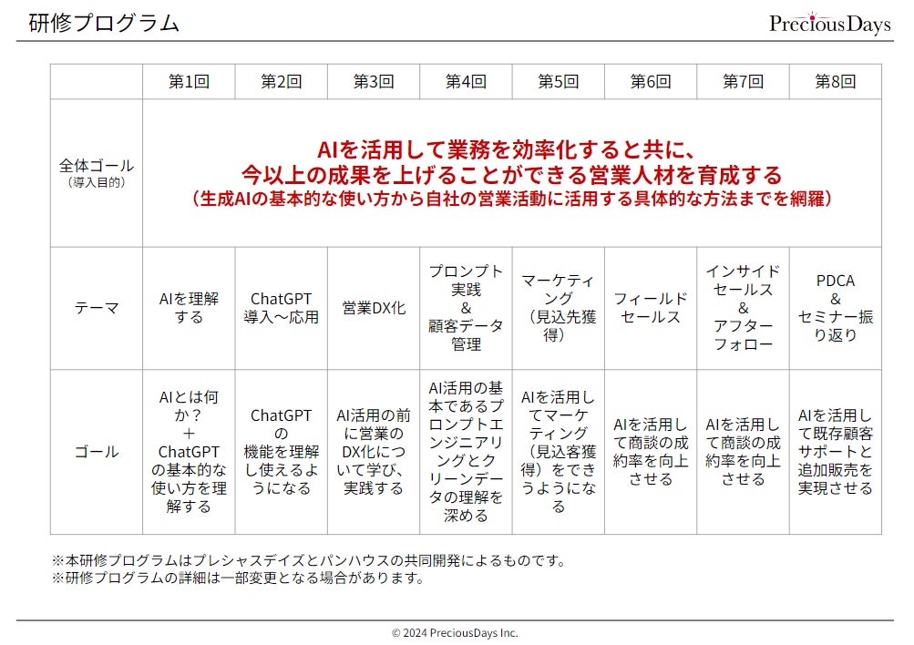中小企業の営業支援を手掛けるプレシャスデイズ株式会社(本社:東京都中央区、代表:増山 順一)は2024年7月24日(水)より、東京大学松尾研発スタートアップの株式会社パンハウスと共同開発した中小企業の営業力向上に特化した生成AI導入研修サービスを開始いたします。