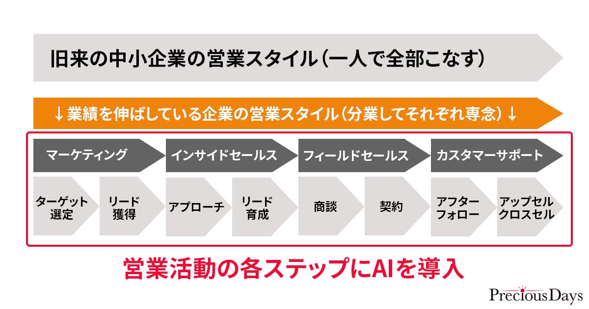 旧来の営業といえば、担当者が見込み客発掘から商談・アフターフォローにいたるまで全てのステップを一人で行っていましたが、DX化の進む昨今では、特に業績を伸ばしている企業は営業ステップを細分化し、それぞれのステップで高度な専門チームを結成しています。