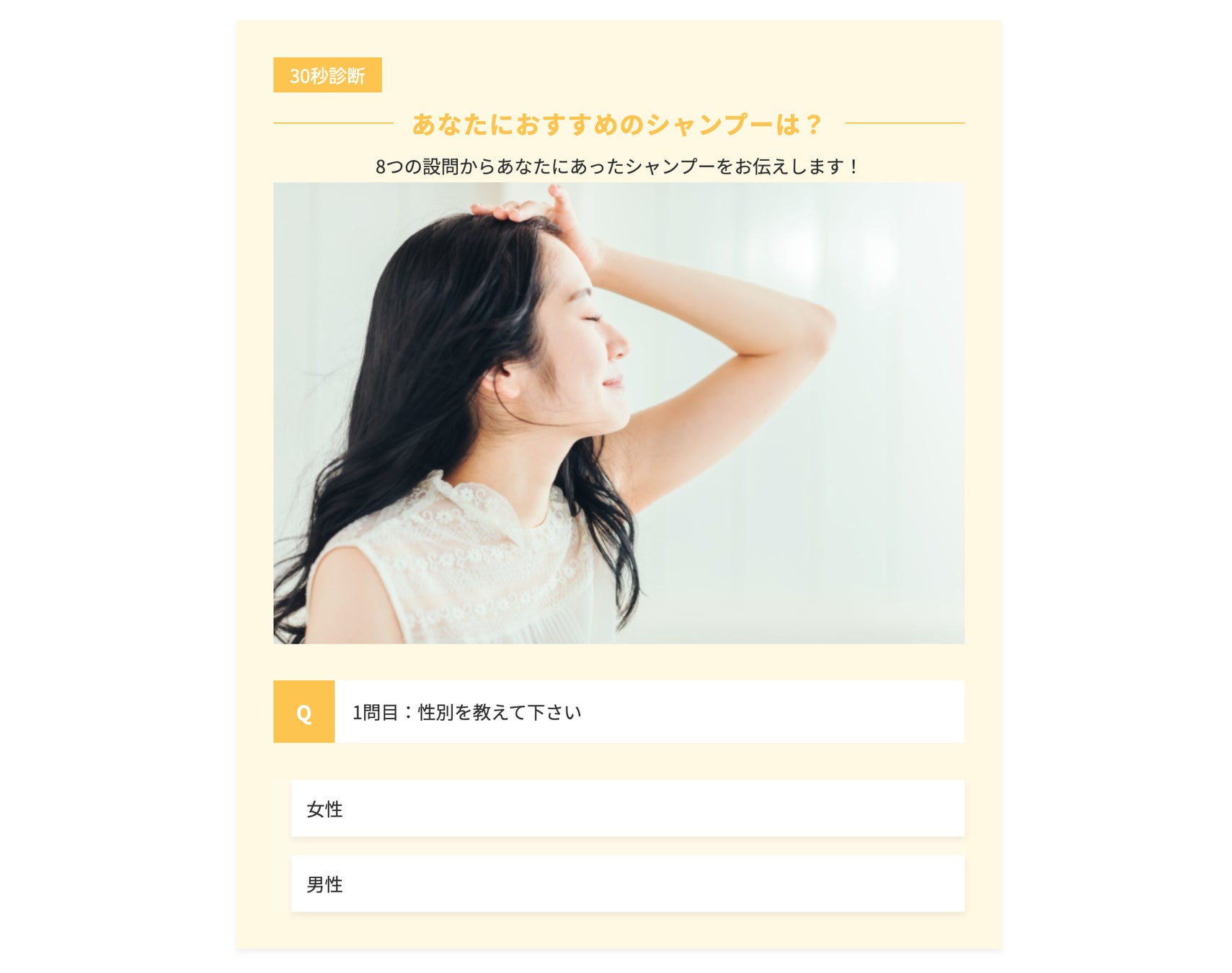 それでも「自分にあったシャンプーがわからない…!」という方にために、30秒ヘアケア診断も設けているので、質問に回答していくとあなたにあったシャンプーを回答させていただきます。