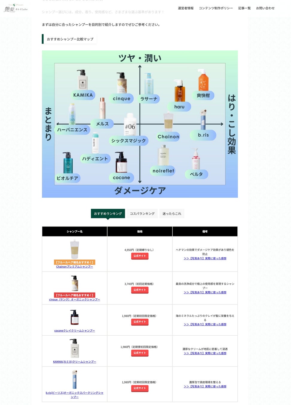 また記事内には、比較マップや表のタブ分けを行い、読者様ご自身の悩みに応じてシャンプー・トリートメントを選択できるような工夫を行っています。