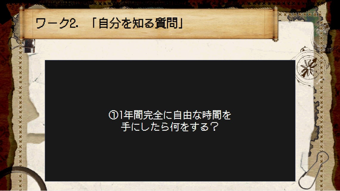 日常から離れた設定の問いに対して、自分の答えを考えます。こちらも皆の個性の光る回答続出です!考えたことがないような角度の問いで、普段見えていない自分の価値観が見えてきます。