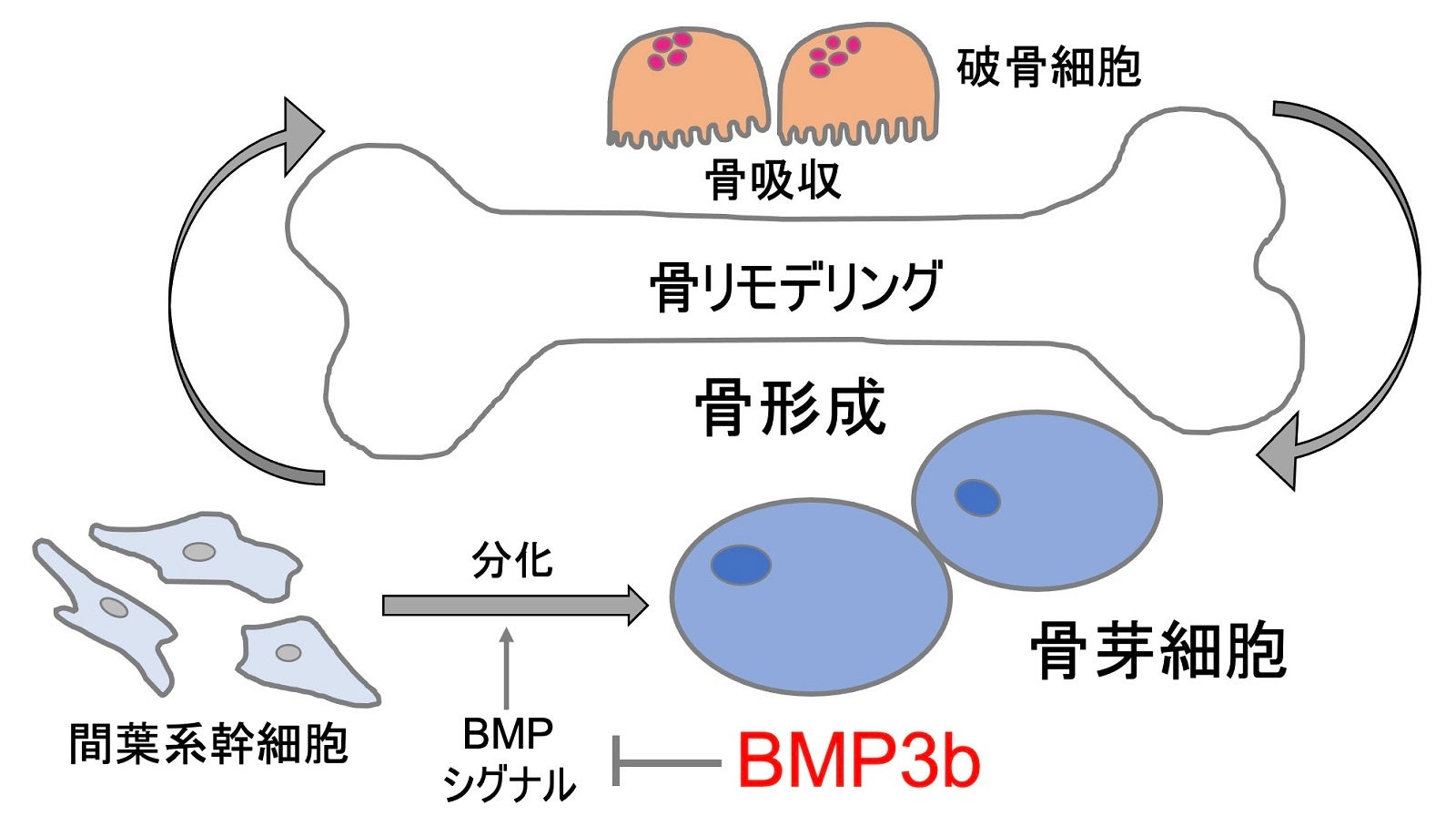 以上より、BMP3bは「骨を作る」BMPが受容体に結合するのを抑制し、BMPシグナルを減弱させることで、間葉系幹細胞から骨芽細胞分化ならびに骨の量を制御している可能性が示されました(図)。
