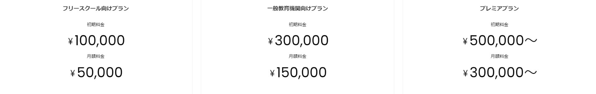 料金は、不登校支援を行っているフリースクールまたは個人が経営する学習塾などの場合は初期料金100,000円、月額料金50,000円、公立・私立の高等学校、大学、その他教育機関向けの場合は初期料金300,000円、月額料金150,000円で利用することができます。また、教育機関は休みが多いため、夏休みなどのサービスを利用しない期間(月単位)は月額料金が発生せず、再開する場合も初期料金が必要ないなど、柔軟な対応が可能になっています。