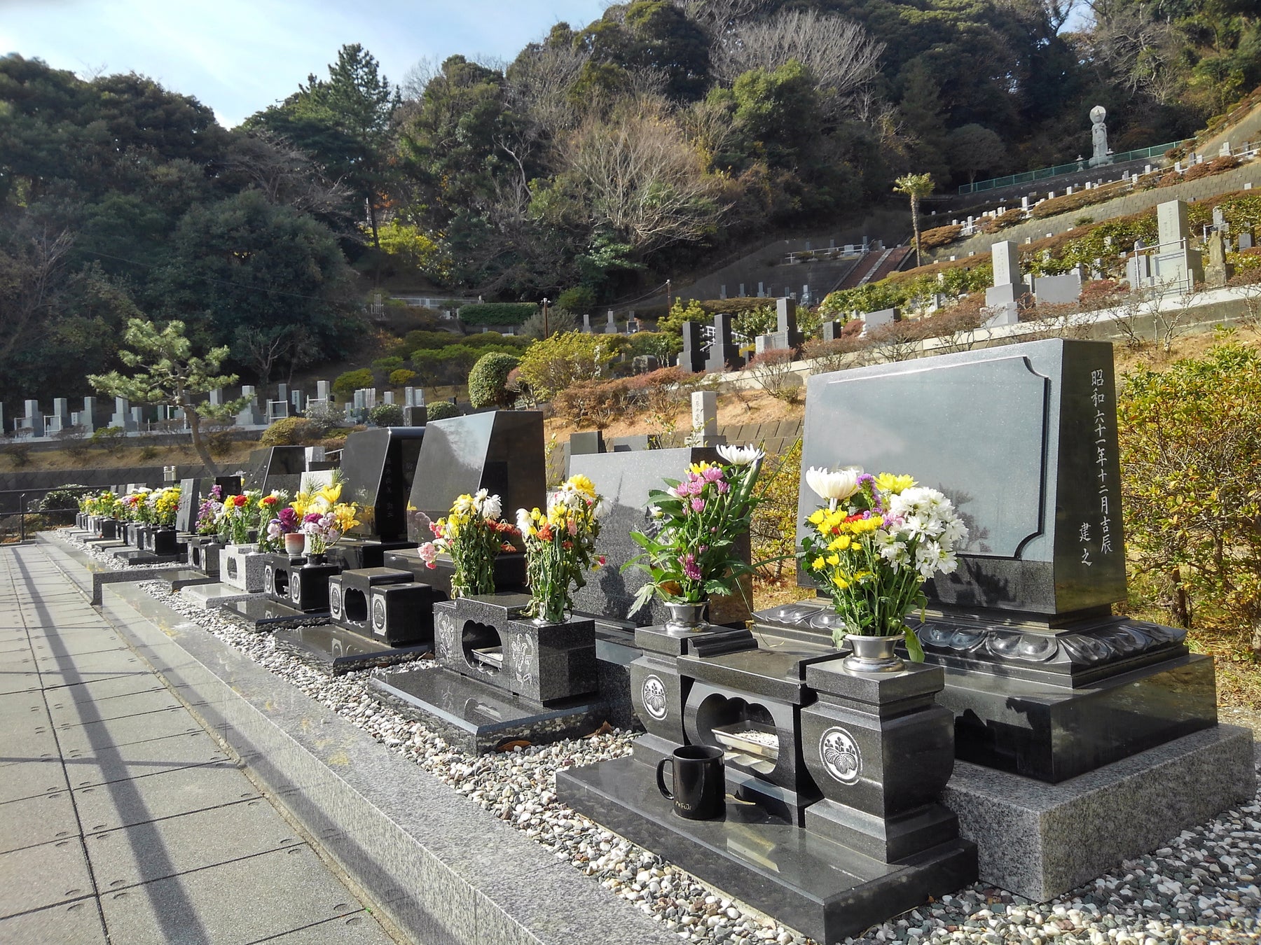 久里浜霊園は1969年設立。東京湾を展望する小高い丘の上にあり、眼下に雄大な海原が広がるロケーションです。晴れた日は遠く房総半島まで望む抜群のロケーション。6万㎡という広大な敷地には四