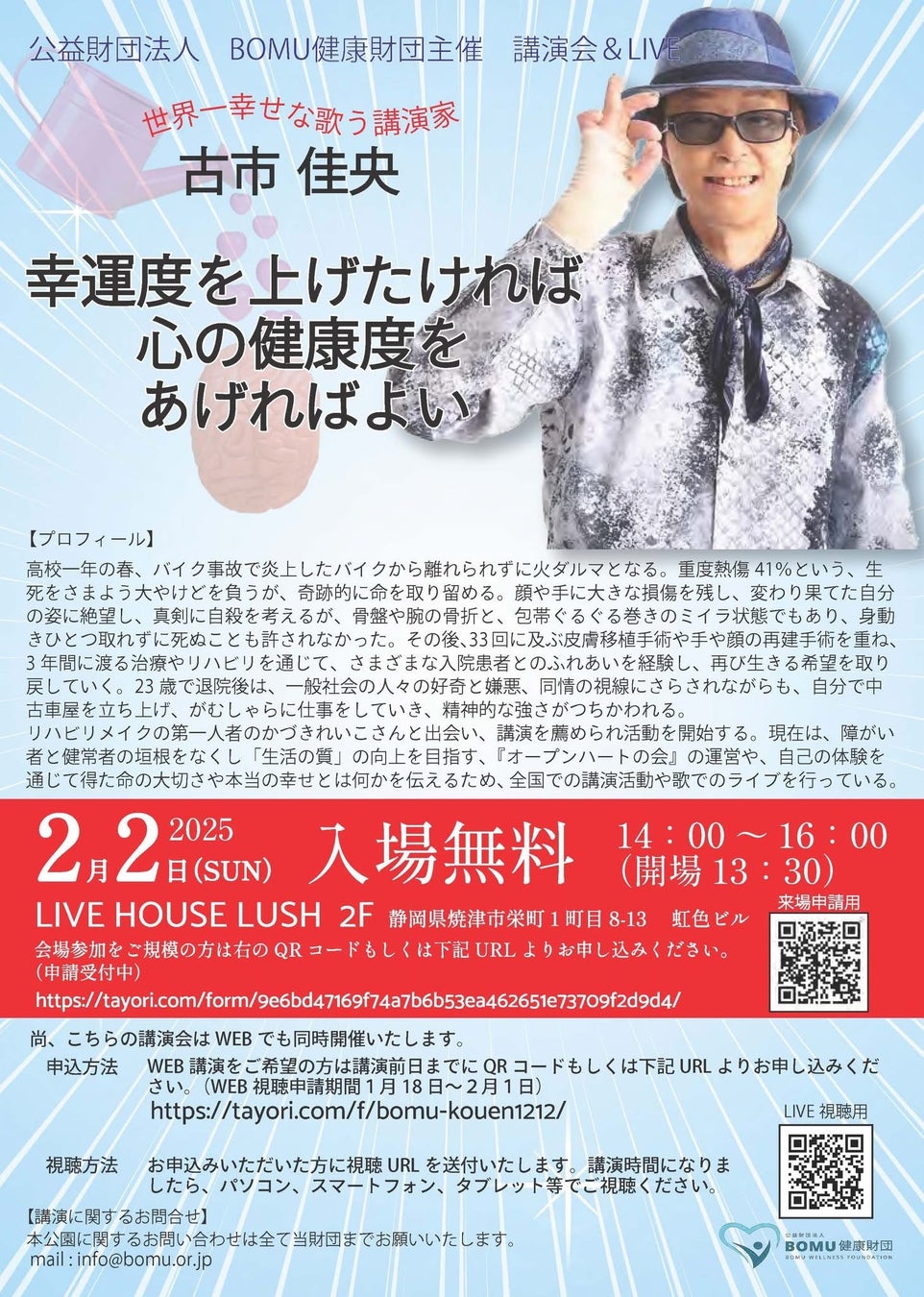 公益財団法人BOMU健康財団による講演会は年4回程度の開催となっておりますが、2月の講演会「幸福度を上げたければ心の健康度をあげればよい」は古市佳央氏によるお話と歌(ライブ)という、いつもとは少し異なるスタイルでの開催。
