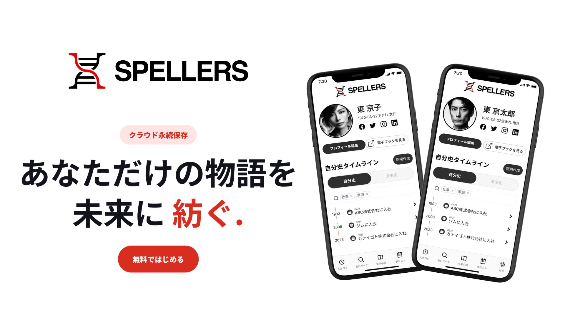 人材紹介やSaaS事業を展開するカナイゴト株式会社(本社:東京都港区、代表取締役:金井敦史) は、2024年7月20日にビジネスパーソン向け近未来型自分史作成サービス「SPELLERS」をリリースいたしました。「SPELLERS」は、Alを活用した自己完結型のオンライン自分史作成プラットフォームです。ユーザーのこれまでのキャリアから家族、趣味、夢、未来まで、人生に関する唯一無二の物語をクラウド上に永久保存し、大切な人々と共有することができます。