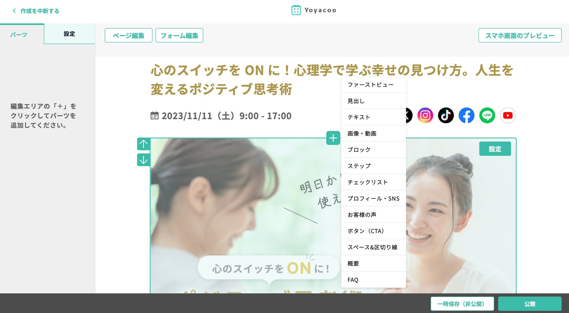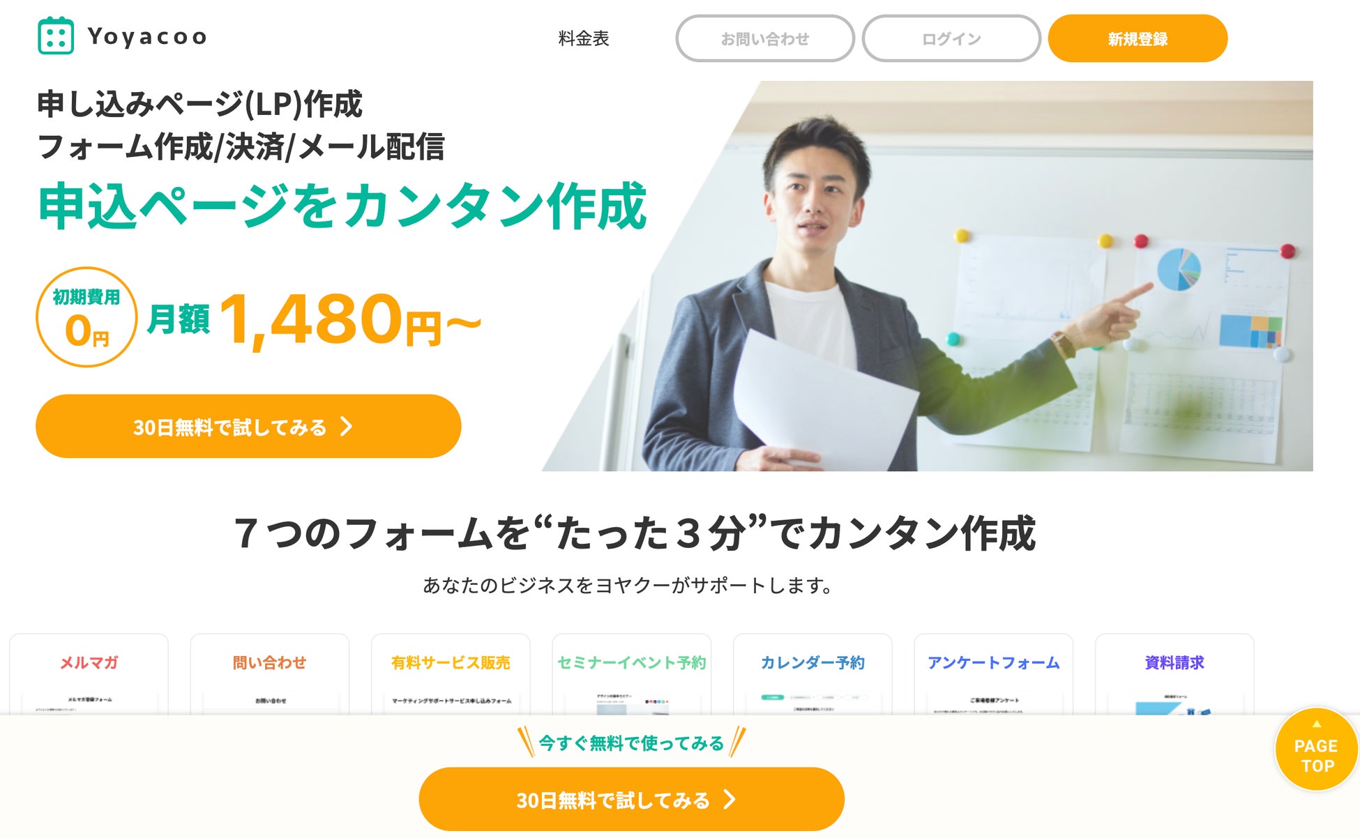 ヨヤクーはイベント・セミナー、個別予約等7つのカテゴリーの申し込みフォーム・オンライン決済・予約のLPを簡単作成。オンラインビジネスの仕組みを丸ごと提供します。