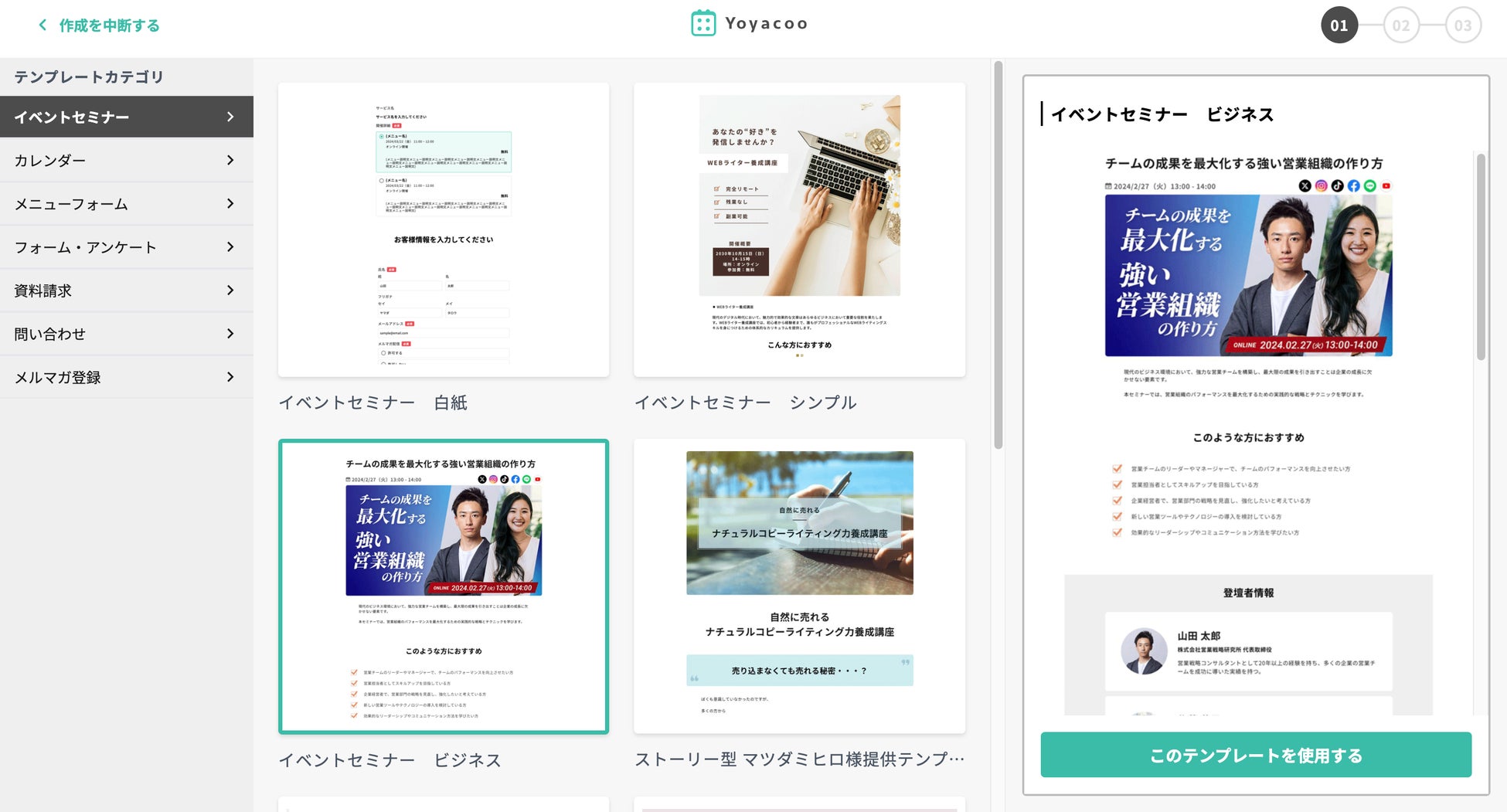 ヨヤクーでは「イベント、セミナー」「カレンダー(個別予約)」「メニューフォーム」「フォーム・アンケート」「資料請求」「問い合わせ」「メルマガ登録」と7つのカテゴリーの申込フォームを作ることができ、それぞれのテンプレートを使うことで画像、テキストの変更するだけで、簡単に美しいLPを作成することができます。