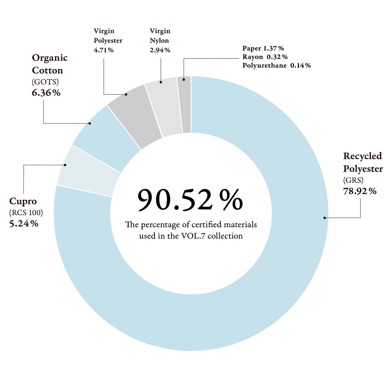 VOL.7では、コレクションのうち232型中138型 (約59%) のLCAを算出をしました。また、認証素材の使用率はこれまでで最も高い「90.52%」となりました。「2030年までのカーボンニュートラル達成」という目標を掲げ、今後も原料/素材メーカー各社とともに取り組みながら、全ての商品において再生素材を中心とし環境負荷を低減した衣服の実現を目指します。