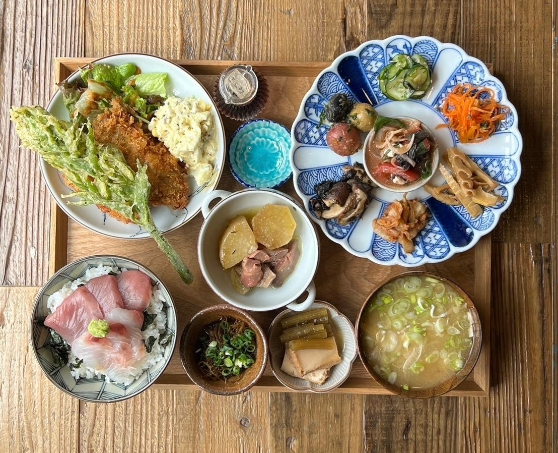 地域の規格外野菜や未利用魚など、食べられるのに流通しない食材を使った定食が人気のレストラン。2024年8月1日に現店舗の2軒隣の複合施設「魚常荘」に移転し、薬膳喫茶「御自愛喫茶」と同時オープン。