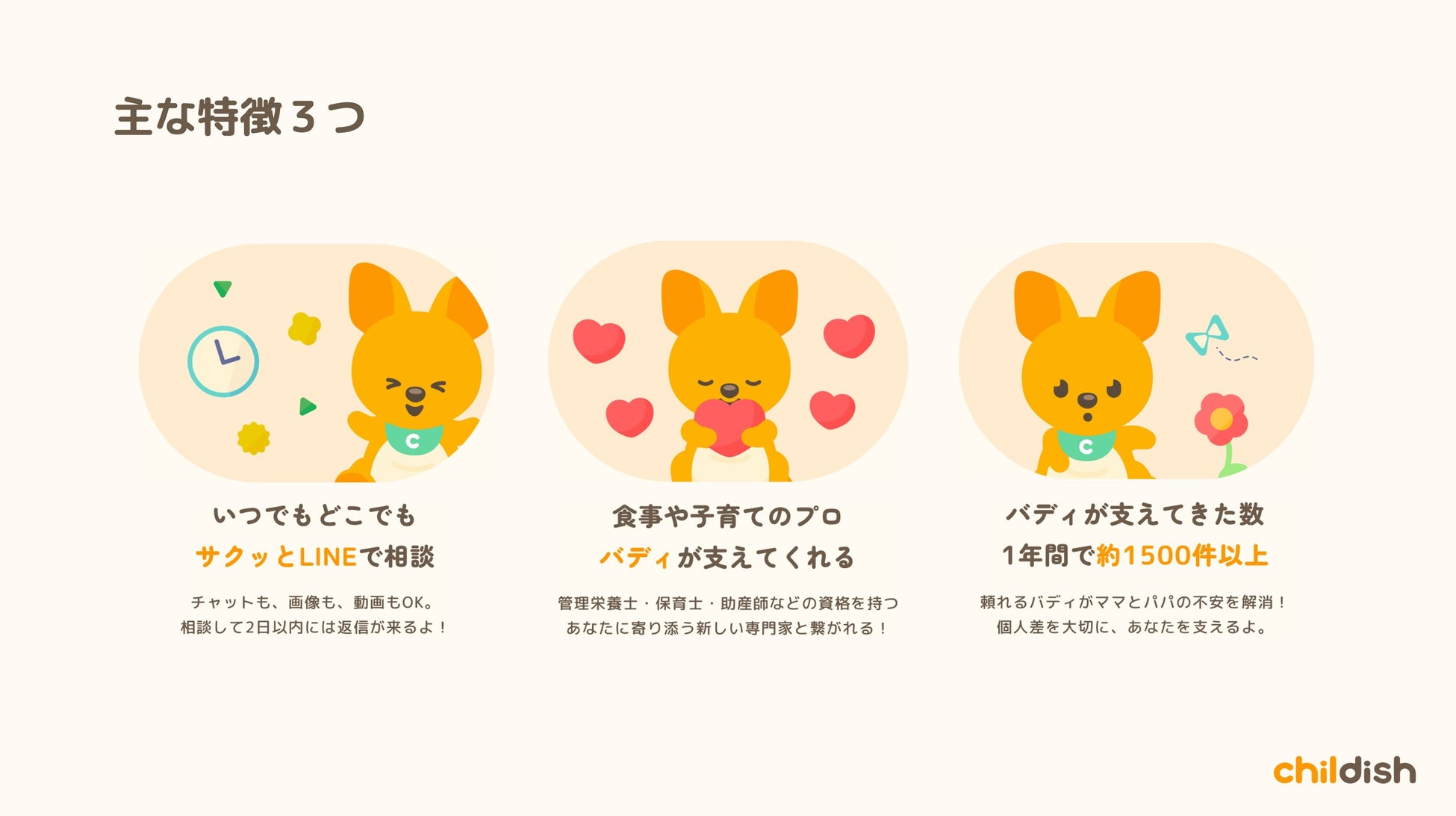 バディとは「管理栄養士、保育士、助産師、歯科衛生士」をはじめとしたチルディッシュが生み出した子育ての専門家集団です。しかし、バディはただ単に専門的な知識をママパパに提供するのではなく、寄り添う気持ちを第一に、ひとりひとりにあったアドバイスやサポートをお届けします。