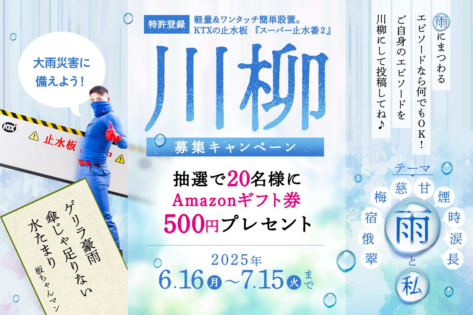 自動車金型メーカーとして培った高精度解析技術を活かして『スーパー止水番2』などの防災・減災製品を開発・製造するKTX株式会社(本社:愛知県江南市、代表:野田 太一)では、おうち時間の増える雨のシーズンを少しでも愉しんでもらうため、そして、大雨・豪雨災害の増えるシーズンへの備えも、併せて考えていただくため、雨にまつわるプチ愉しいキャンペーンを開催いたします。