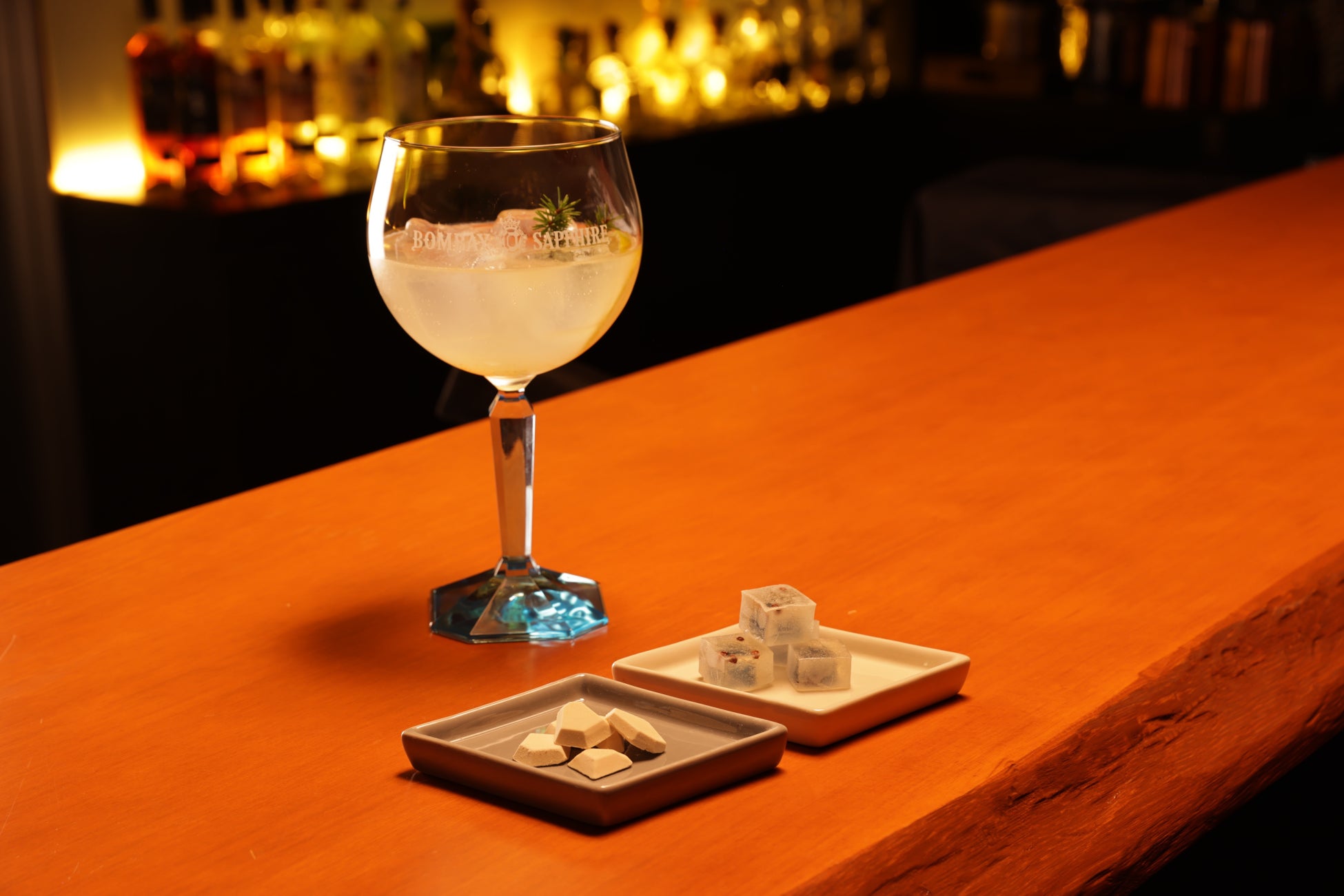 本展では、ボンベイ・サファイアの香り付けに欠かせない10種類のボタニカルに焦点を当てました。「香りを纏う」をテーマに、象徴的で華やかなジュニパーベリーの香りを纏った秋の柑橘カクテルと、ペアリングフードとして一口菓子を制作しました。