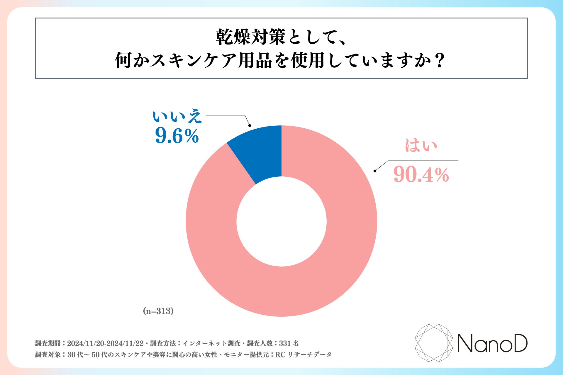 次に、冬になると肌の乾燥が気になると回答された方に、「乾燥対策として、何かスキンケア用品を使用しているか」を問う設問の回答では「はい」が90.4%、「いいえ」が9.6%となりました。この結果から、冬の肌の乾燥が気になる30代~50代女性の9割以上が乾燥対策に何かスキンケア用品を使用している、ということが明らかになりました。
