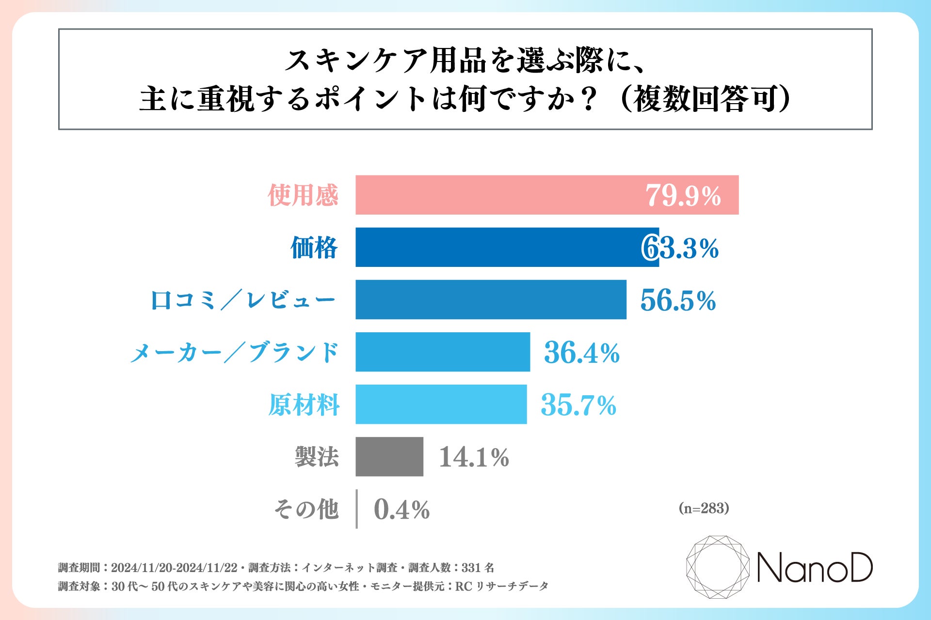 スキンケア用品を選ぶ際に、多くの方が主に重視するポイントは「使用感」「価格」「口コミ/レビュー」