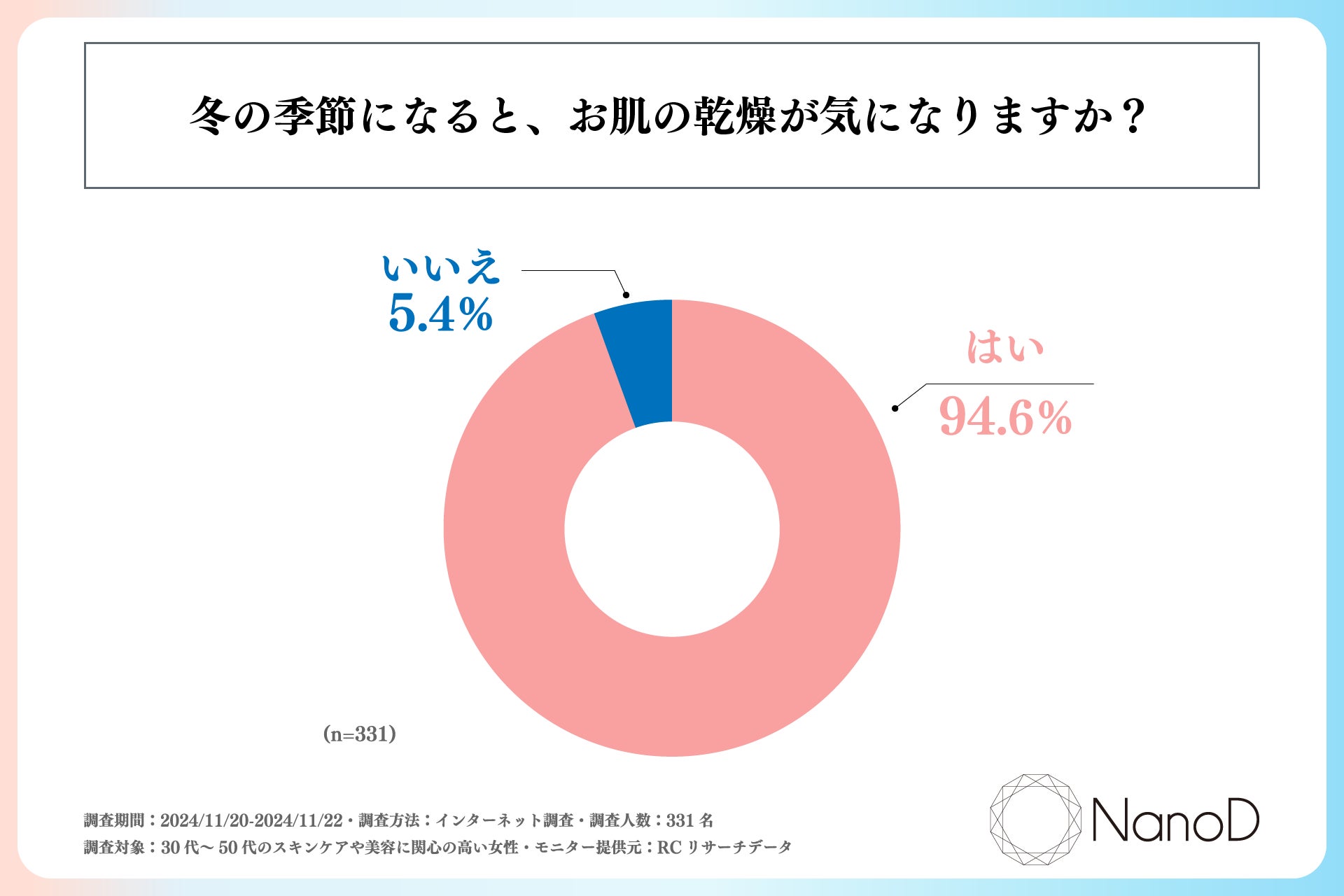 まず、「冬の季節になると、お肌の乾燥が気になるか」を尋ねる設問への回答では、「はい」が94.6%、「いいえ」が5.4%という結果になりました。この結果から、スキンケアや美容に関心の高い30代~50代の女性の大多数が、冬になると肌の乾燥を気にしている、ということがわかりました。