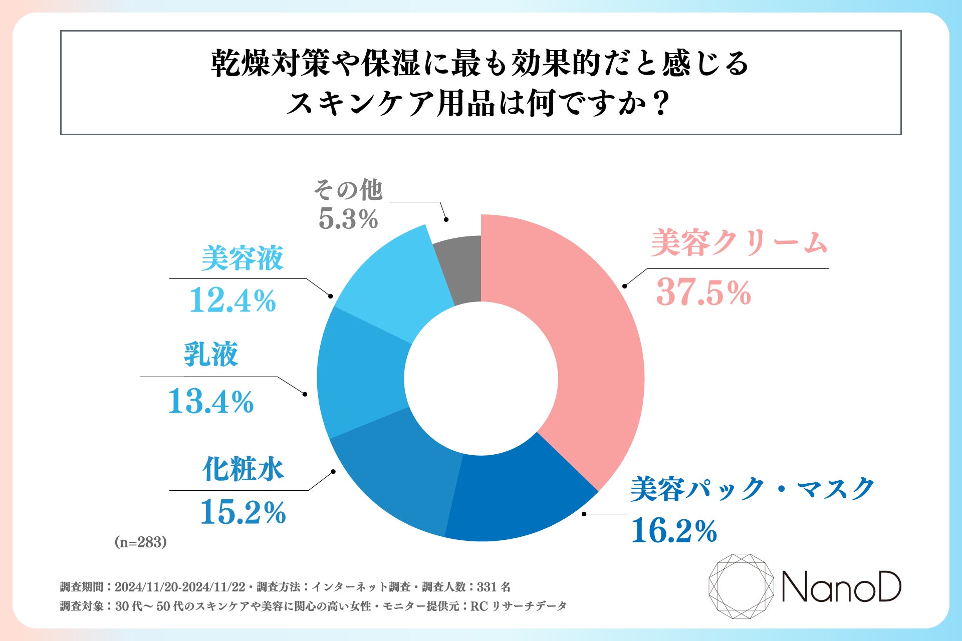 最も乾燥や保湿に効果的だと感じるスキンケア用品は「美容クリーム」、次いで「美容パック・マスク」