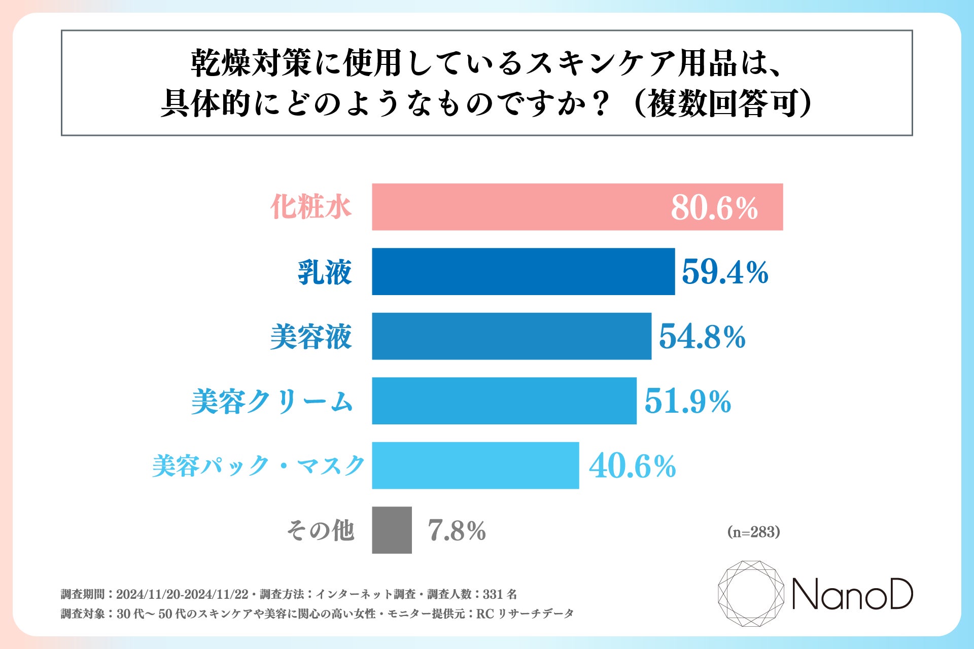 この調査結果から、30代~50代の女性が乾燥対策にどのようなスキンケアを行っているかなど、その実態が明らかになりました。