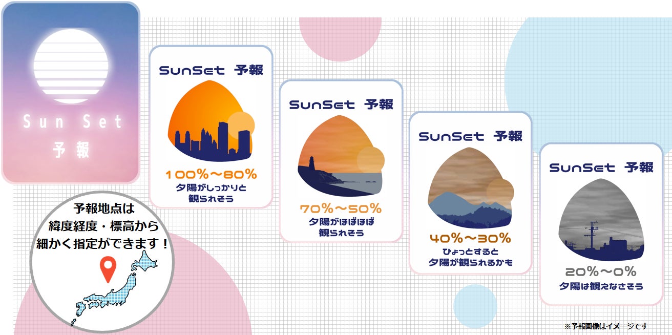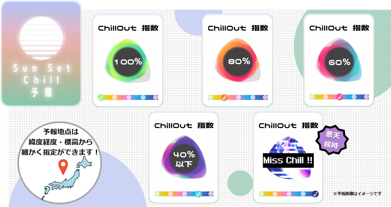 加えて近年では若者を中心に「エモい(エモーショナル)」と並び、「チルい(チルアウト)」という言葉が使われている通り、チルアウト(リラックスをする、まったりするなどの意味)という概念が広く浸透をしてきています。令和時代の新しいカルチャーともいえるチルアウト。そのチルアウトを指数にして予報化した日本初となるSunSet Chill予報も合せて開発しリリースいたしました。