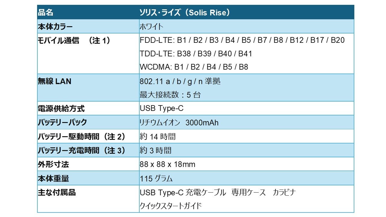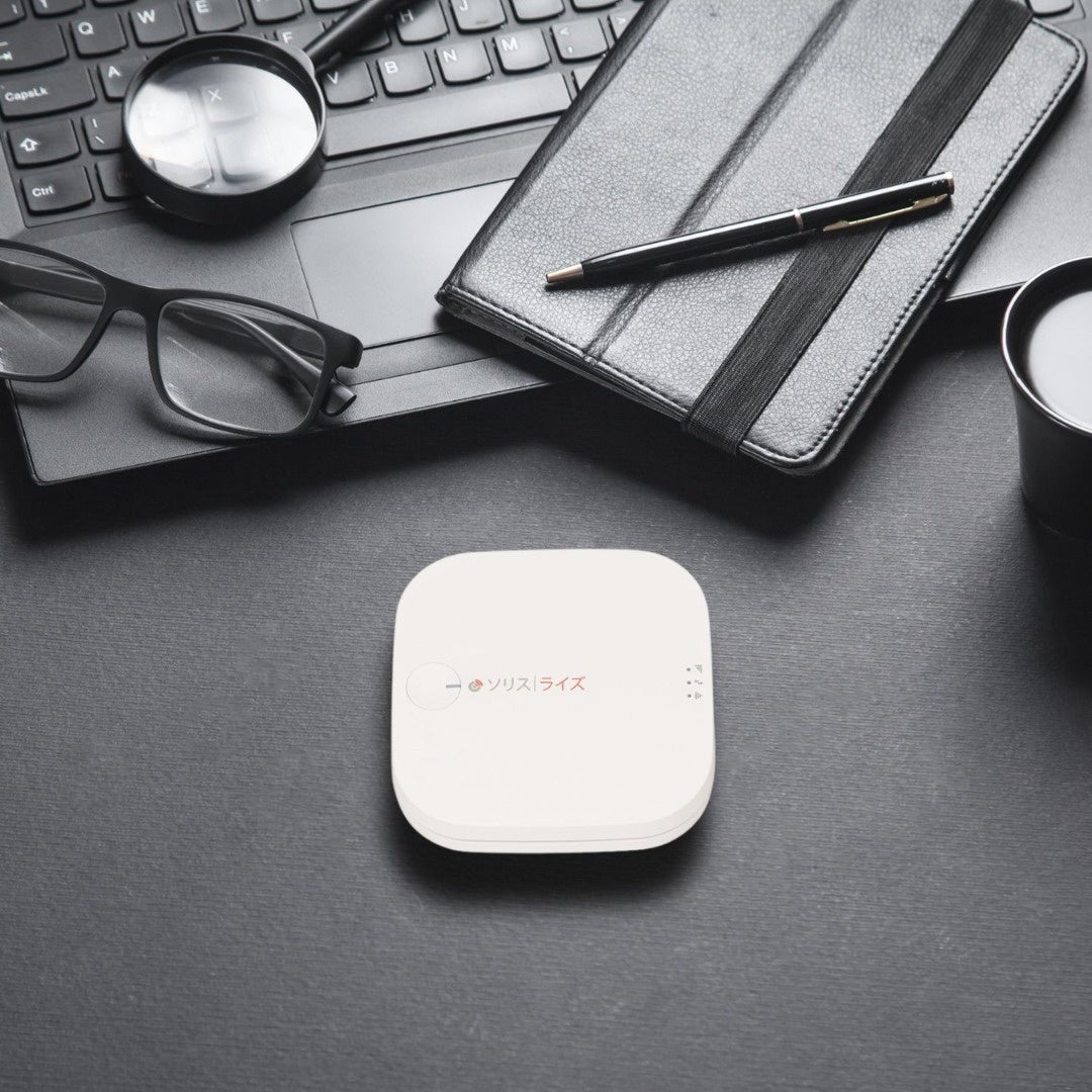 トップ・アップWiFiのルーター端末は、SIMO社の最新4G端末「ソリス・ライズ(Solis Rise)」です。もちろん、SIMカード不要のヴァーチャルSIM端末です。ディスプレイを省いた軽量薄型のシンプルな設計で、持ち運びはもちろん、自動車内でも平置きしやすい設計となっています。(製品仕様は、文末をご参照下さい。)