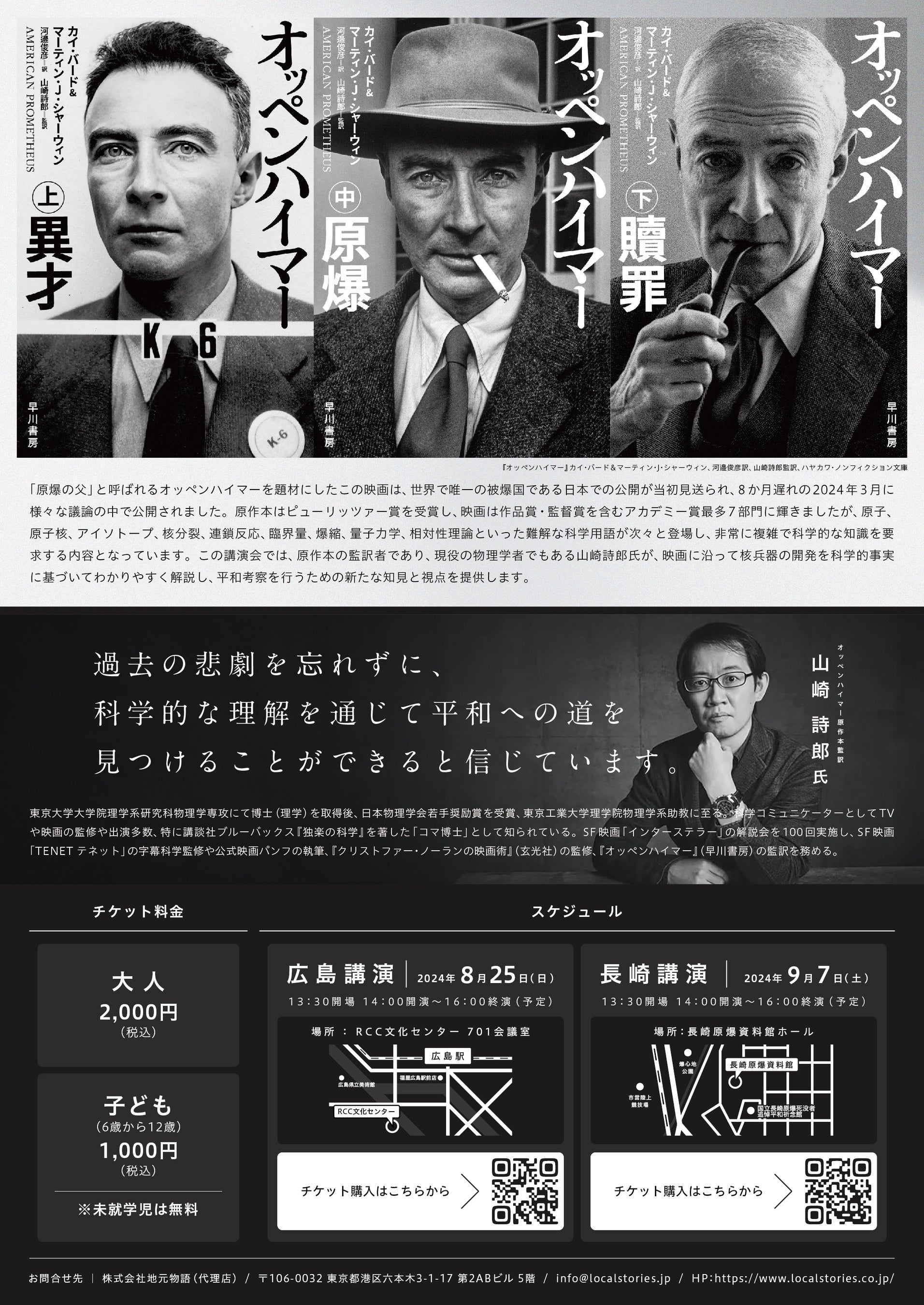 この夏、そんな議論に欠かせない“科学的事実”に基づいた講演会を、広島・長崎にて開催いたします。講師は、映画の原案本を監訳した物理学者・山崎詩郎氏です。講演会では、原案本に記載されている「アイソトープ」「核分裂」「臨界量」といった難解な科学用語を、映画の内容に沿って分かりやすく解説しながら、平和考察を行うための新たな知見と視点を提供します。