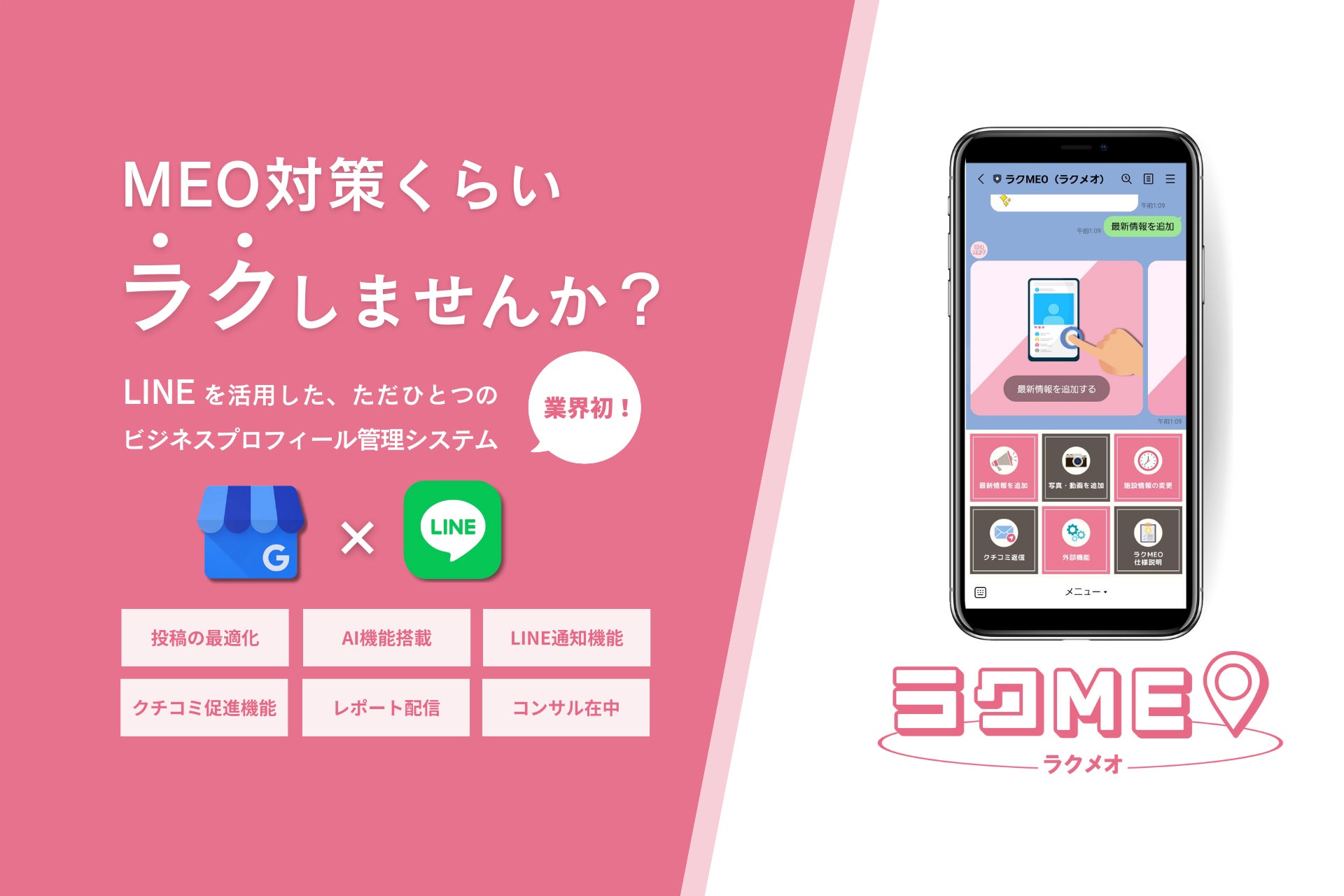 ラクMEOは、誰もが使い慣れているLINEのみで完結し、ChatGPT機能を搭載した新しいMEO運用ツールです。Googleビジネスプロフィールを活用し、店舗ビジネスの集客にご活用いただけますと幸いです。