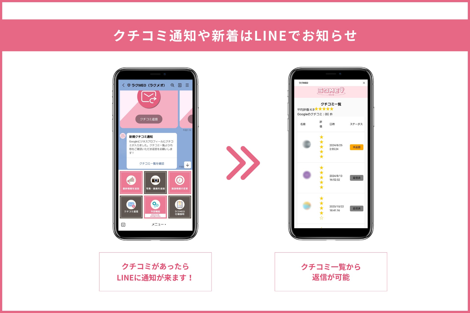 ユーザーからのクチコミや、Googleの新しいMEO 新着情報などに関してLINEにプッシュ通知がきます。日常生活に根付いたLINEでの運用が可能だからこそ、返信漏れの防止や重要なGoogleのアルゴリズムの変化にも臨機応変に対応することが可能です。