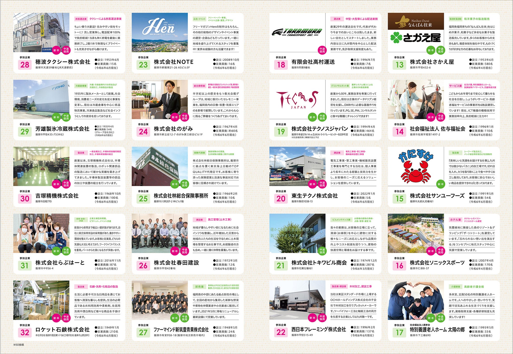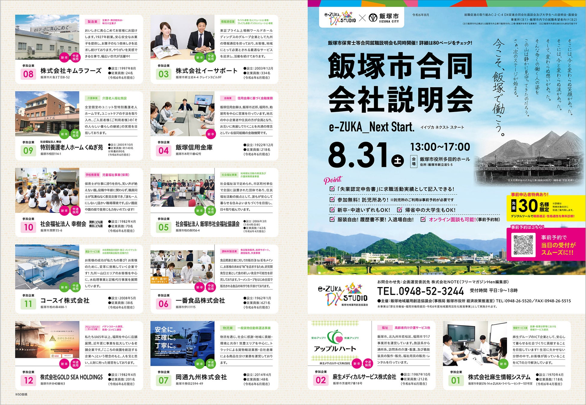 飯塚地域雇用創造協議会(福岡県飯塚市)は「飯塚市合同会社説明会」(企画運営委託先:株式会社NOTE)を、8月31日(土)に開催。昨年多くの方が来場した当イベントは、飯塚市内の多様な業種の企業32社が集結し、飯塚市内の企業と求職者が直接面談できる貴重な機会となる。