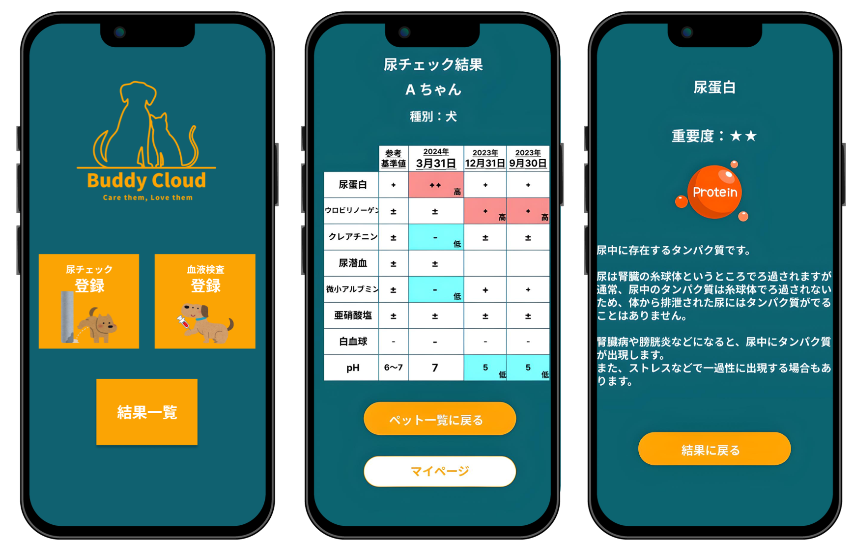 本サービスを活用することで、当社が提供する愛犬・愛猫向け尿検査キット「Buddy Medical Check」の検査結果確認や結果蓄積の他、通常紙媒体で自宅に保管されている血液検査結果のデジタル化と蓄積が可能になります。それにより、愛犬・愛猫の体調不良の早期発見・早期対処ができる自宅での環境構築を実現します。
