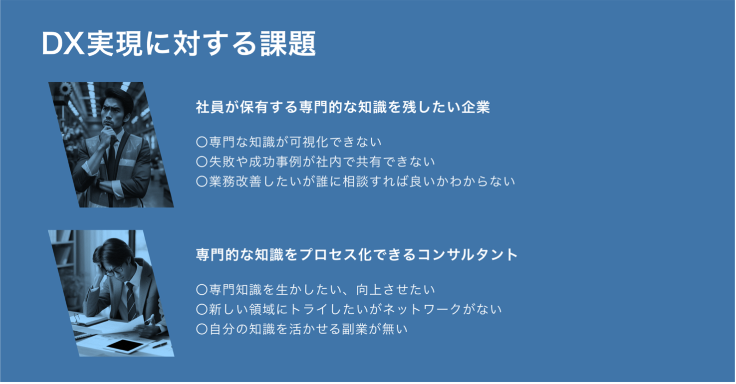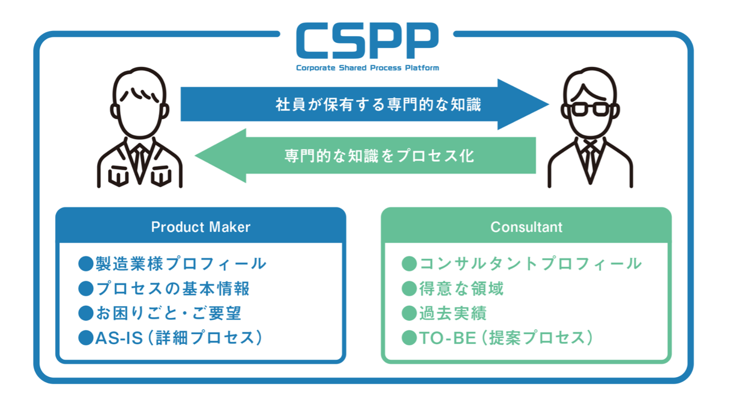 CSPPは、「社員が保有する専門的な知識を残したい企業」と、「専門的な知識をプロセス化できるコンサルタント」とを効率的にマッチングします。これにより、企業内の知識が体系化され、だれでもアクセス可能な形で保存されます。