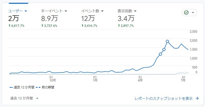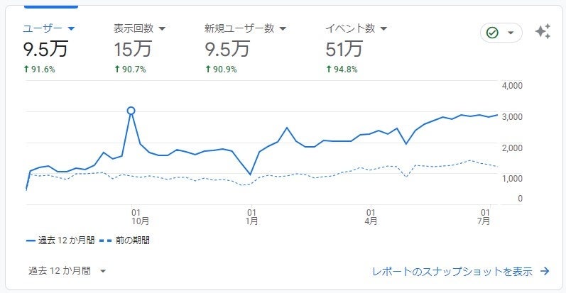 下記のグラフは、実際に1年間、少しずつコンテンツをサイトにアップさせていった会社の実際のアクセス解析(GA4)です。ユーザー数で見ています。