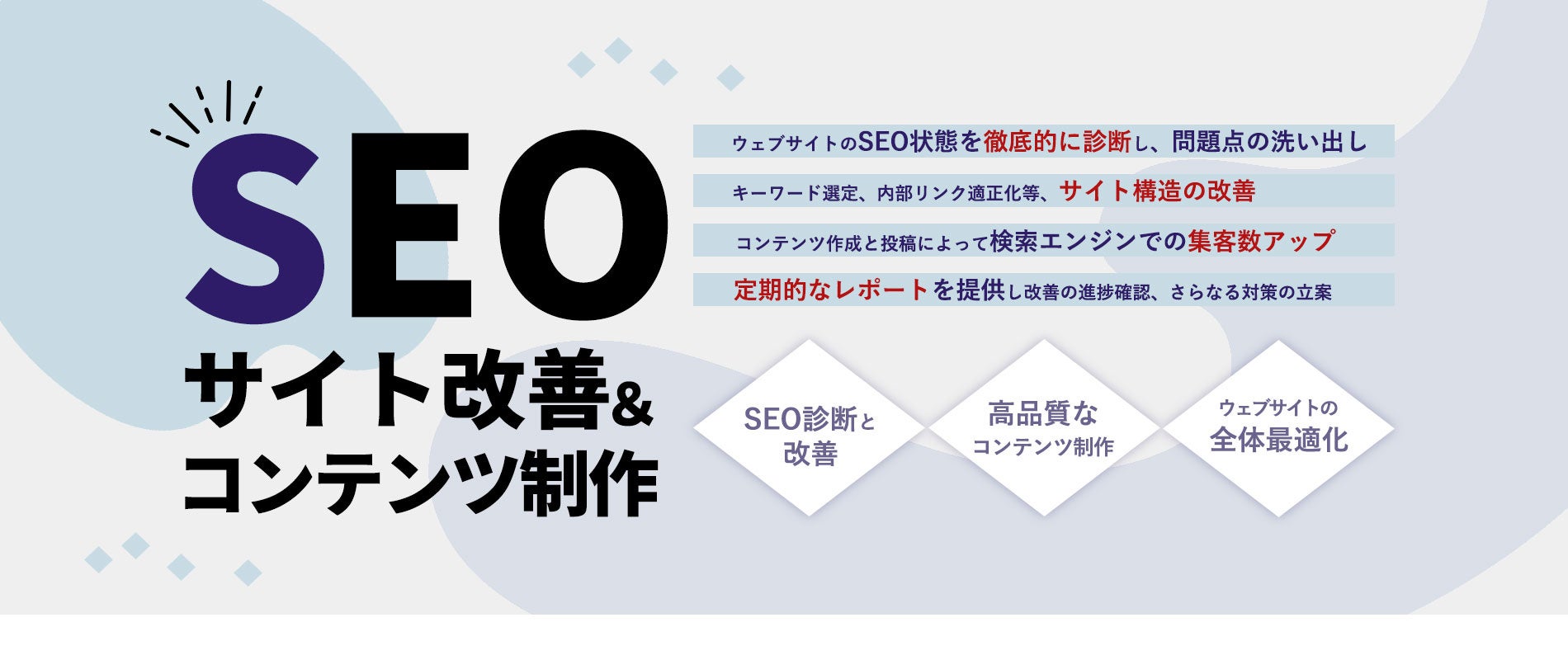 「SEOサイト改善&コンテンツ制作サービス」は、以下の4つの柱を中心に展開されます。