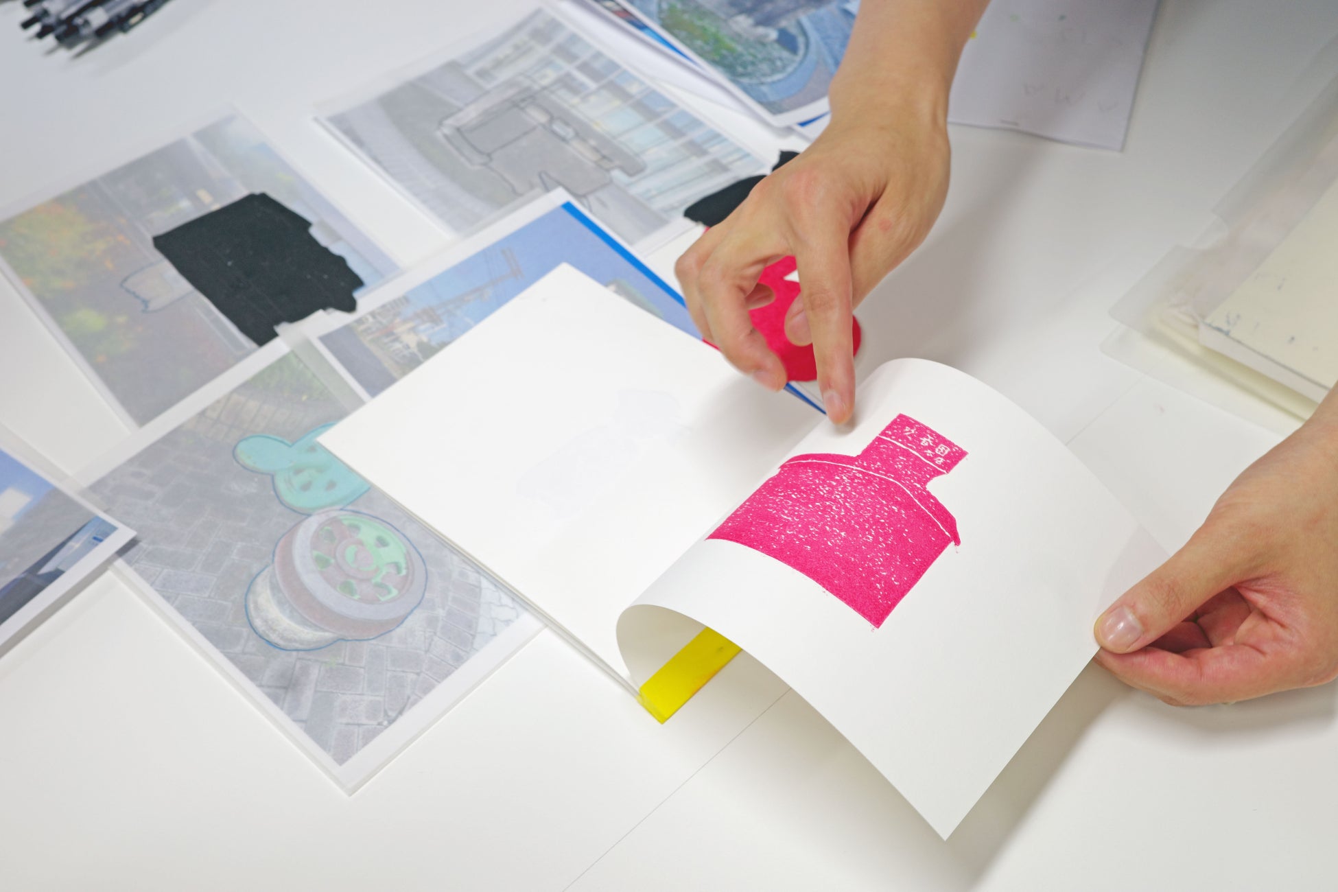 このツアーでは参加者限定の一日体験プログラムとして、金山のまちなかにあるグラフィック、モニュメント、建築物からさまざまな形を探します。その形を「コラグラフ」という印刷手法を用いて手作業での版画・印刷・製本を体験します。世界にひとつだけのオリジナルZINEを作りましょう!
