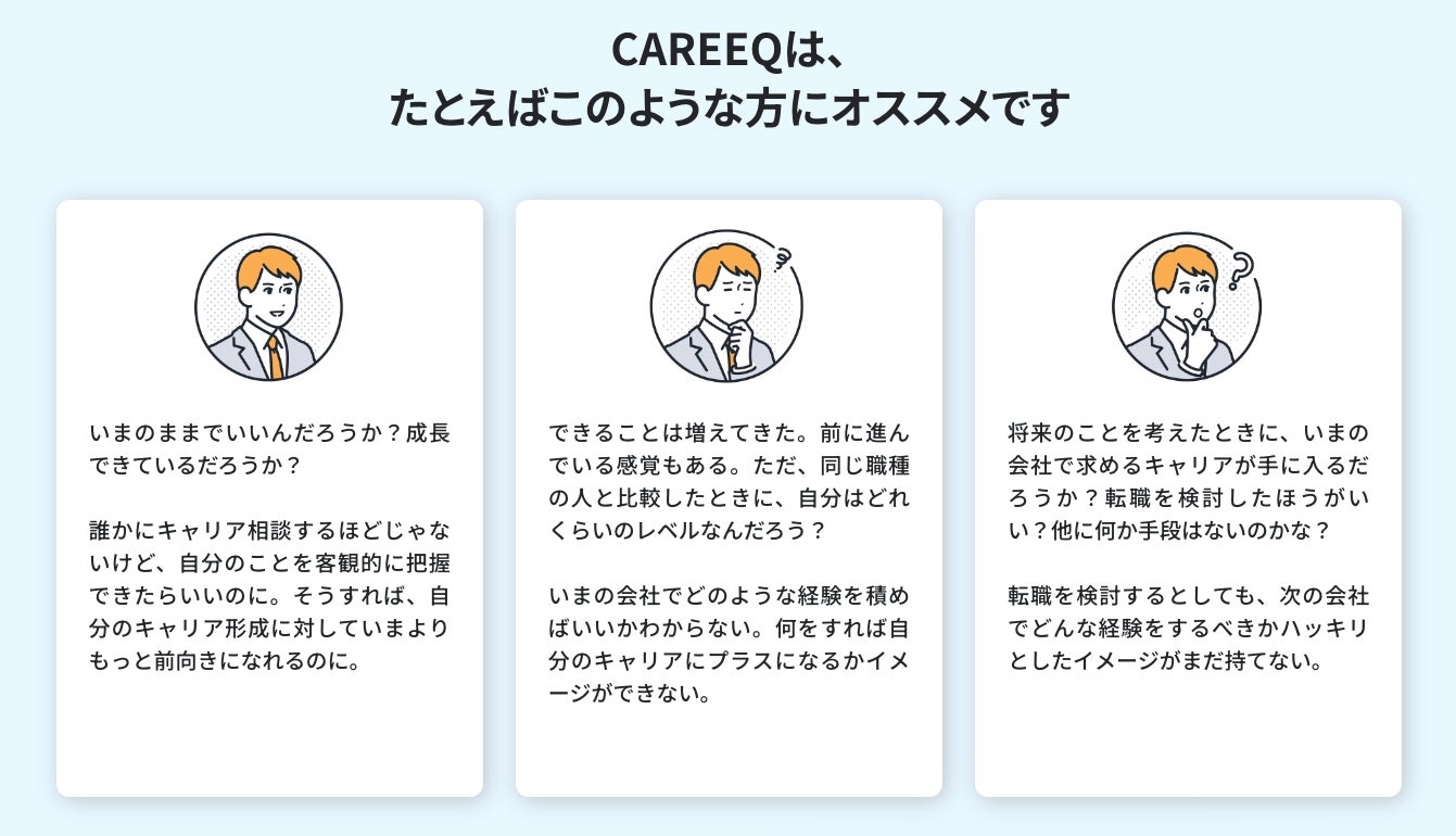 ディプコアのミッションである、『最適解を追求し、日本を良くする「つながり」を創る』に基づいてCAREEQを開発しました。転職を考えている方だけでなく、現職に在職中の方にも、キャリアの壁打ちサービスとして、より良いキャリアを手にしたいすべてのビジネスパーソンに、長くご利用いただけるものになれたらと心より願っております。
