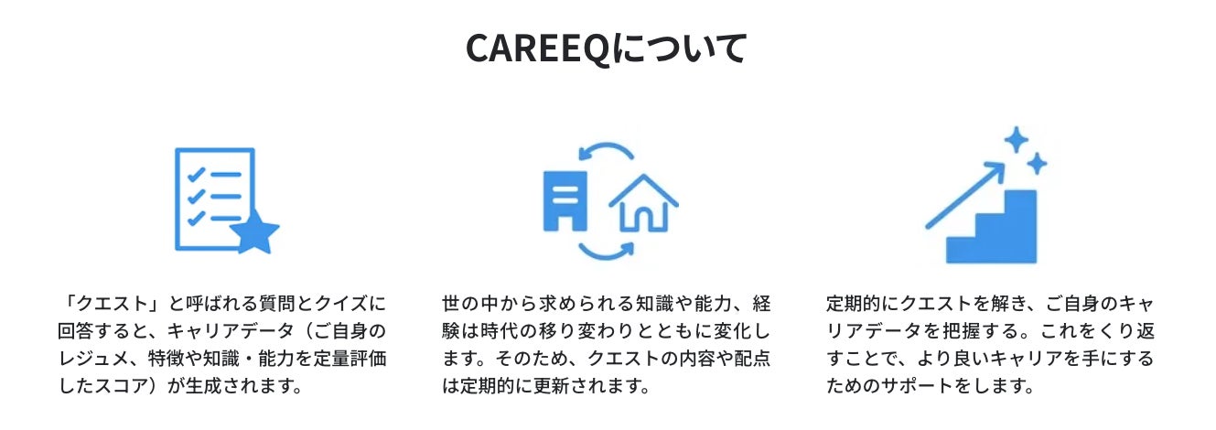 「CAREEQ」は、より良いキャリアを手にしたいと考えるビジネスパーソンを支援するために開発したサービスです。「クエスト」と呼ばれる質問とクイズに答えることで、キャリアデータ(ご自身のレジュメ、特徴や知識・能力を定量評価したスコア)を自動生成。定期的に更新されるクエストにチャレンジし、ご自身のキャリアデータをアップデートすることで、成長を把握できるサービスです。