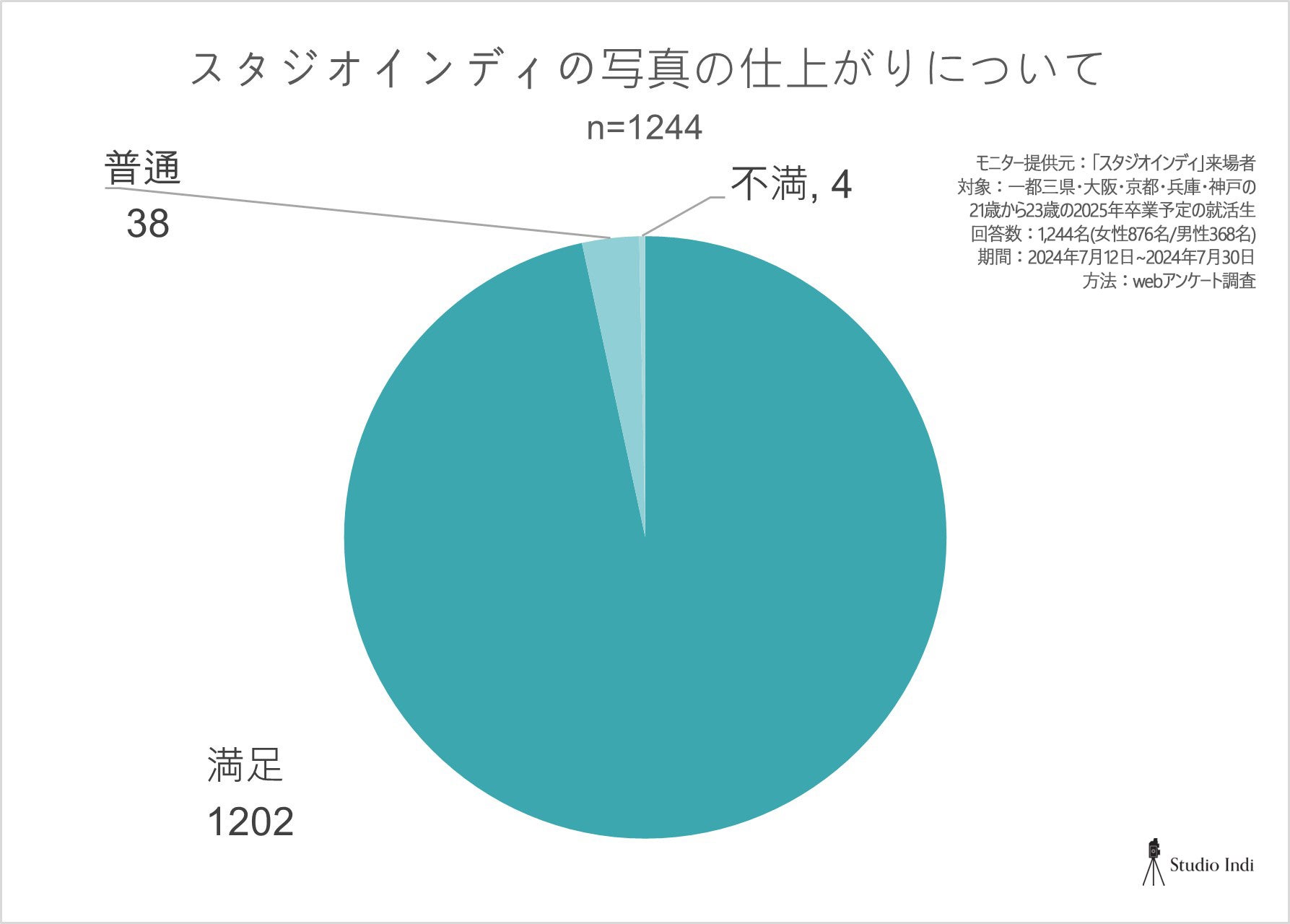 スタジオインディを利用した就活生1,244名に対してのアンケート調査の結果、約96.6%の1,202名の方から「満足」の回答を頂くことが出来ました。